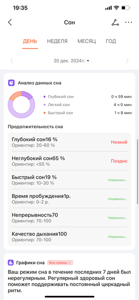 Далее, здесь есть «Дыхательные упражнения», «Погода», «Будильник», «Секундомер», «Таймер», «Компас», «Фонарик» (экран часов включается на максимальную яркость и отображает белое поле), «Поиск устройства» (то есть смартфона), «Камера» (управление фотосъемкой на смартфоне; доступно в том числе и в связке с iPhone), «Спортивный возраст» (мы писали об этой опции в обзоре Honor Watch 4, никаких изменений не произошло), «Сон». Интересно, что теперь часы с утра показывают отчет о состоянии здоровья, учитывая разные показатели, в том числе по итогам самого сна.