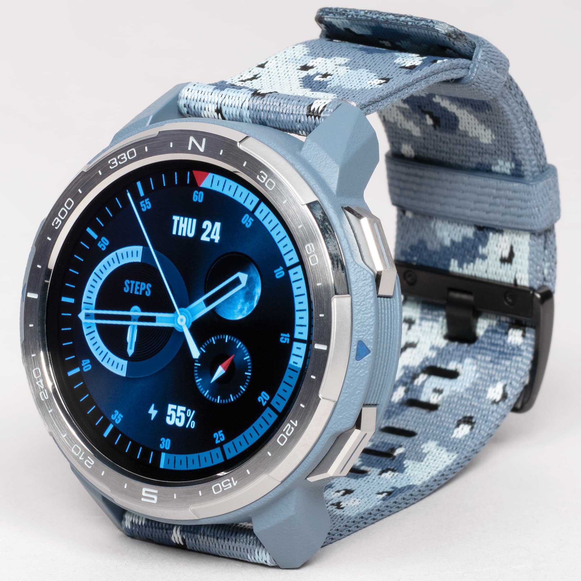 На самих часах сразу доступен выбор из 12 циферблатов, с помощью приложения можно доустановить другие (но только с устройств на Android). Из предустановленных есть настраиваемые (где, например, можно заменить какую-то информацию, выводящуюся на экран, на другую) и обычные. Среди последних — очень подходящий по стилю к данной модели «Камуфляж».