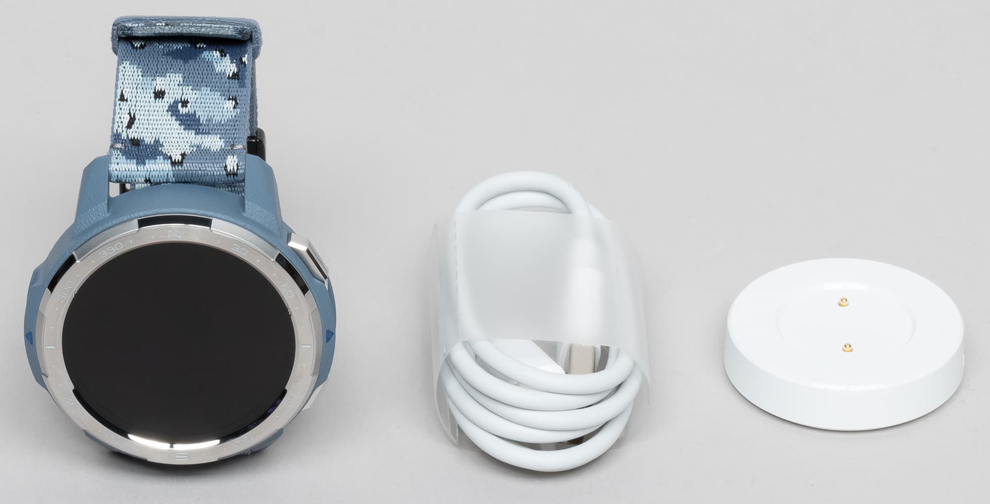 Комплектация же максимально скромная: помимо самих часов — только кабель USB-C, круглая площадка с двумя контактами для подзарядки и листовки.