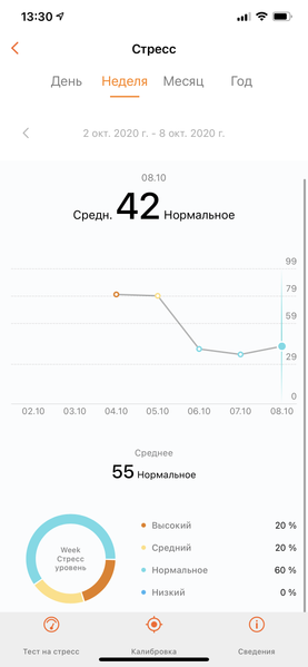 4 октября у автора было очень ответственное и тревожное дело, а 5-го он отправился в командировку в другой город, плохо выспавшись — и устройство выдало высокий уровень стресса в оба дня. А уже 6 октября выспаться удалось и все было куда спокойнее. Наконец, 7-го автор вернулся в Москву — и стресс еще уменьшился. В общем, это достаточно точное попадание.