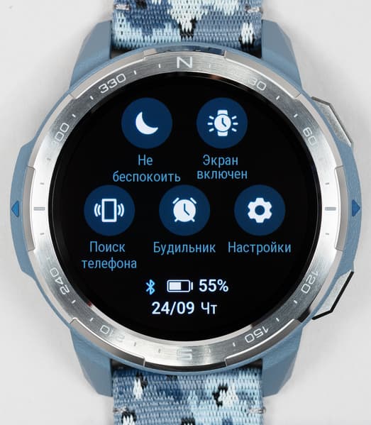 Что касается меню самих часов, здесь все предсказуемо и понятно. Сверху можно вытянуть быстрые настройки, где есть режим «Не беспокоить». А по нажатию на нижнюю физическую кнопку открываются тренировки.