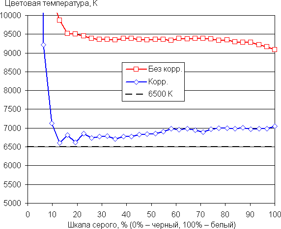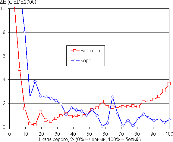 Баланс оттенков на шкале серого без коррекции компромиссный, так как цветовая температура существенно выше стандартных 6500 К, однако отклонение от спектра абсолютно черного тела (ΔE) почти на всей шкале серого ниже 10, что для потребительского устройства считается допустимым показателем. При этом цветовая температура и ΔE мало изменяются от оттенка к оттенку — это положительно сказывается на визуальной оценке цветового баланса. (Самые темные области шкалы серого можно не учитывать, так как там баланс цветов не имеет большого значения, да и погрешность измерений цветовых характеристик на низкой яркости большая.) Коррекцией (точка на круге — как на снимке выше) цветовой баланс удается существенно улучшить.
