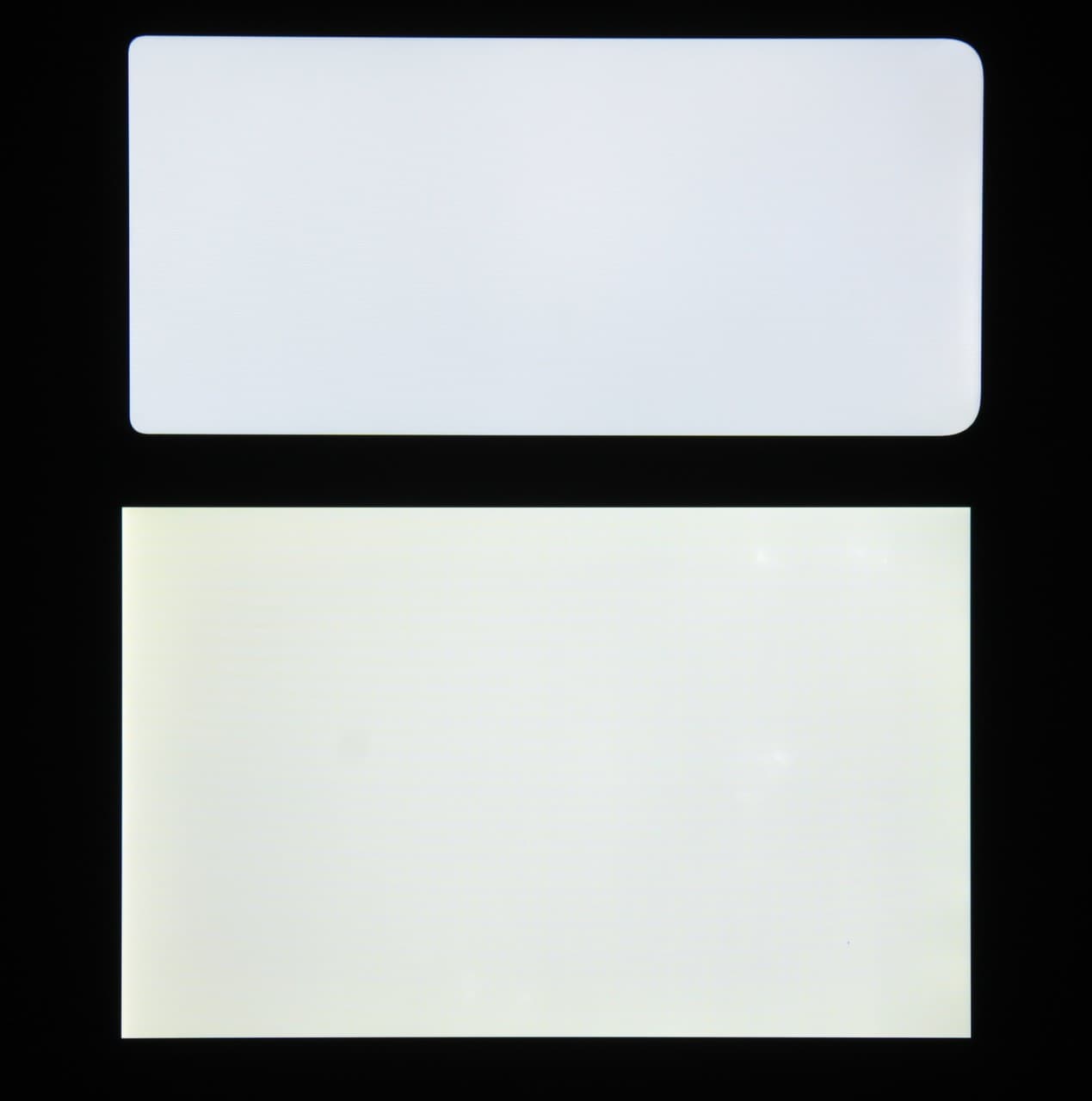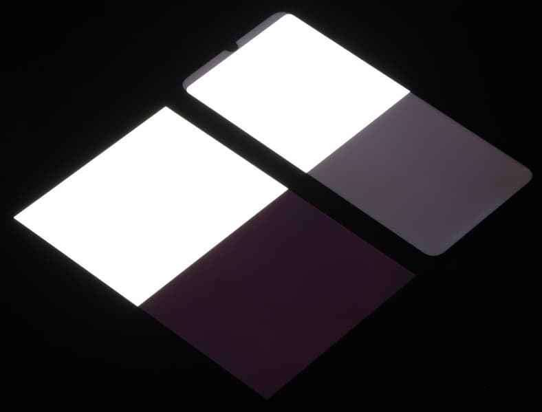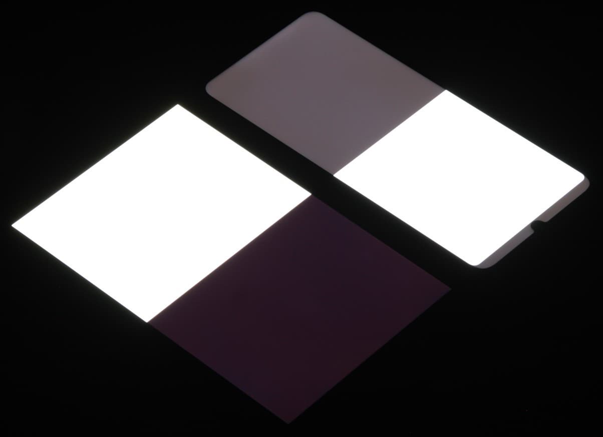 Яркость под углом у экранов уменьшилась (как минимум в 5 раз, исходя из разницы в выдержке), но у смартфона яркость под этим углом немного выше. Черное поле при отклонении по диагонали высветляется сильно, но остается условно нейтрально-серым (так видно глазами). Фотографии ниже это демонстрируют (яркость белых участков в перпендикулярном плоскости экранов направлении одинаковая!):