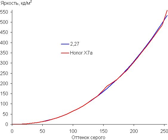 Построенная по 32 точкам с равным интервалом по численному значению оттенка серого гамма-кривая не выявила завала ни в светах, ни в тенях. Показатель аппроксимирующей степенной функции равен 2,27, что близко к стандартному значению 2,2. При этом реальная гамма-кривая слегка отклоняется от степенной зависимости: