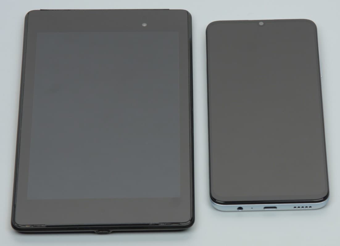 Лицевая поверхность экрана выполнена в виде стеклянной пластины с зеркально-гладкой поверхностью, устойчивой к появлению царапин. Судя по отражению объектов, антибликовые свойства экрана лучше, чем у экрана Google Nexus 7 (2013) (далее просто Nexus 7). Для наглядности приведем фотографию, на которой в выключенных экранах отражается белая поверхность (слева — Nexus 7, справа — Honor X7a, далее их можно различать по размеру):