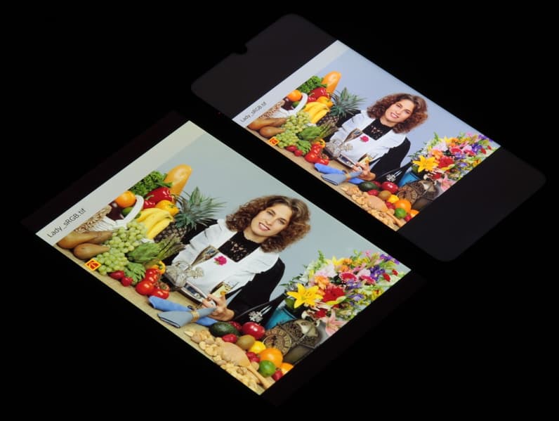 Экран имеет хорошие углы обзора без значительного сдвига цветов даже при больших отклонениях взгляда от перпендикуляра к экрану и без инвертирования оттенков. Для сравнения приведем фотографии, на которых на экраны Honor X7a и Nexus 7 выведены одинаковые изображения, при этом яркость экранов изначально установлена примерно на 200 кд/м², а цветовой баланс на фотоаппарате принудительно переключен на 6500 К.