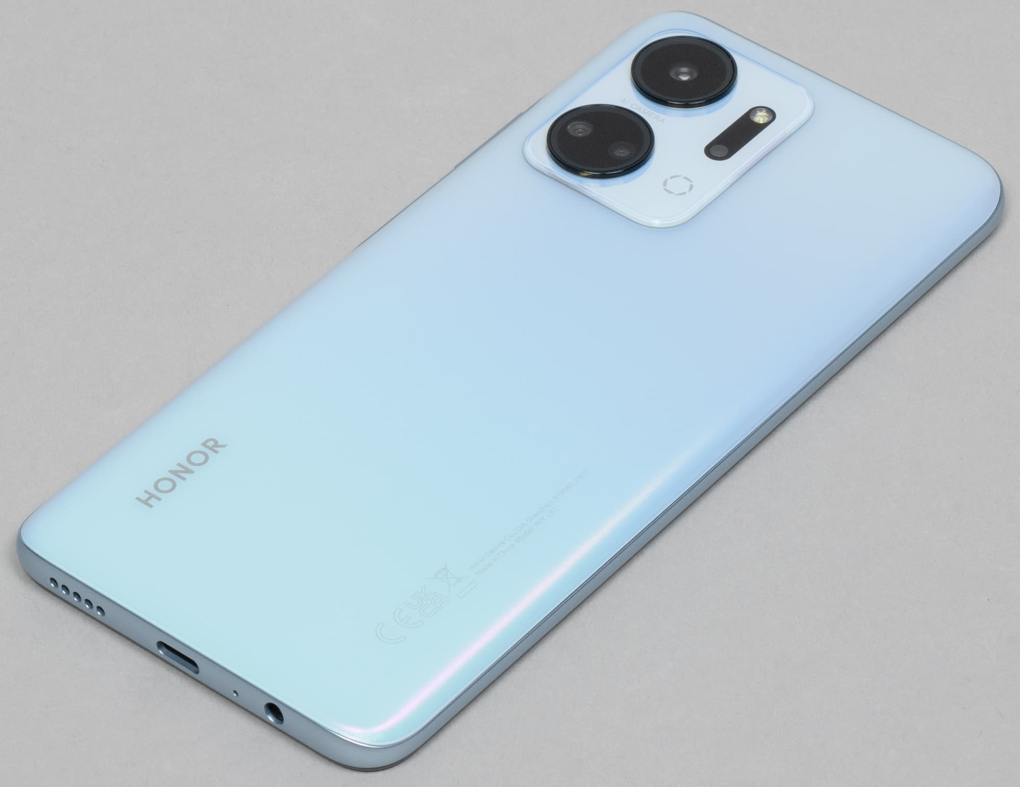 Honor X7a выпускается в трех различных расцветках — черной, синей и серебристой. У серебристого варианта окраса есть легкий градиент от светло-голубого к розовому, а два других варианта окрашены монотонно. Корпус не получил полноценной защиты от воды и пыли.