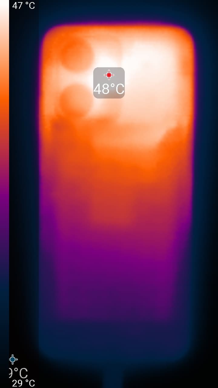 Нагрев больше в верхней части аппарата, что, видимо, соответствует расположению микросхемы SoC. По данным теплокамеры, максимальный нагрев составил 48 градусов (при температуре окружающего воздуха в 24 градуса), это средний нагрев в случае данного теста в сравнении с другими современными смартфонами.