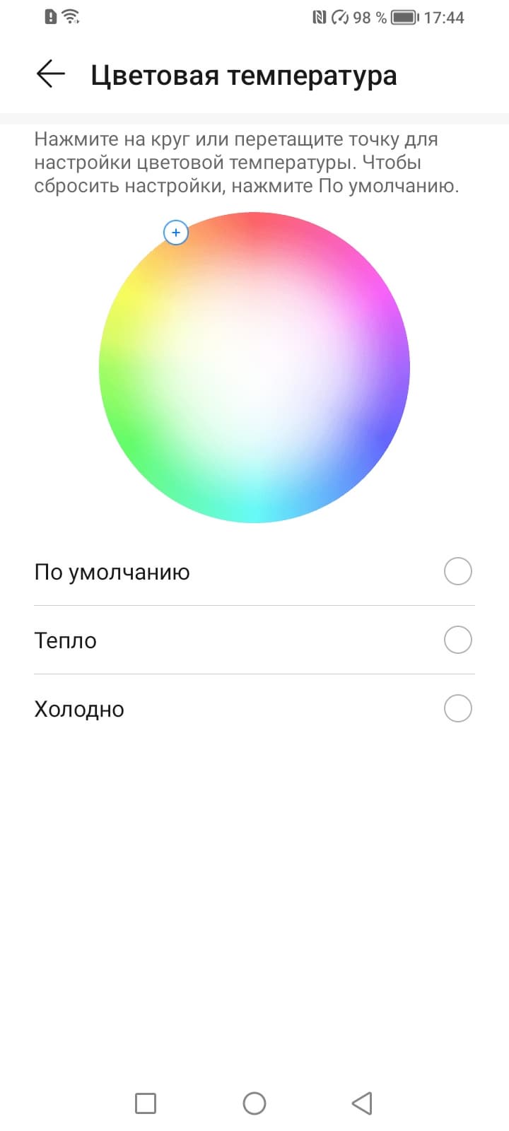 В этом устройстве есть возможность скорректировать цветовой баланс с помощью регулировки оттенка на цветовом круге или просто выбором одного из трех предустановленных профилей.