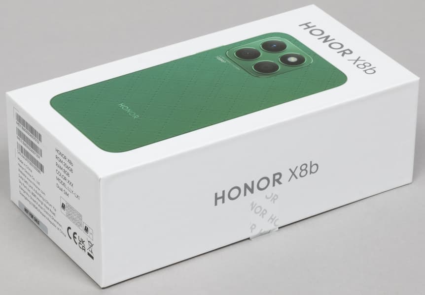 Смартфон Honor X8b поставляется в картонной коробке со стильным лаконичным приятным на вид оформлением.