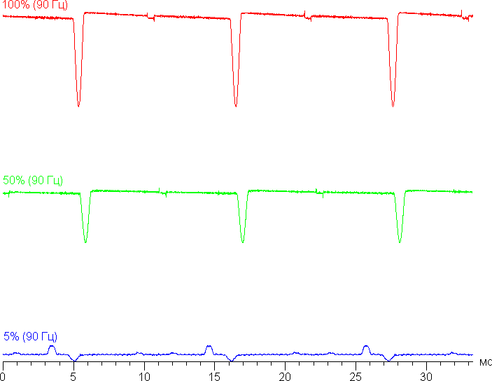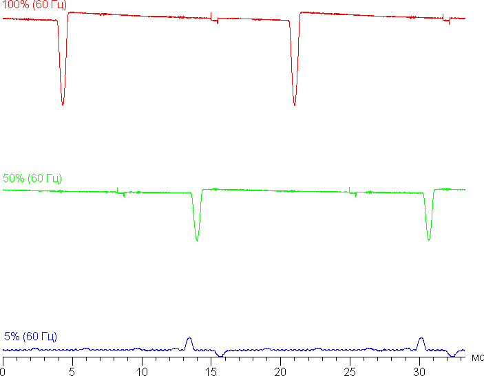 На высоком и среднем уровне яркости присутствует значимая модуляция с частотой примерно 60 или 90 Гц. На рисунках ниже приведены зависимости яркости (вертикальная ось) от времени (горизонтальная ось) для нескольких значений настройки яркости. Сначала для режима с частотой обновления 60 Гц: