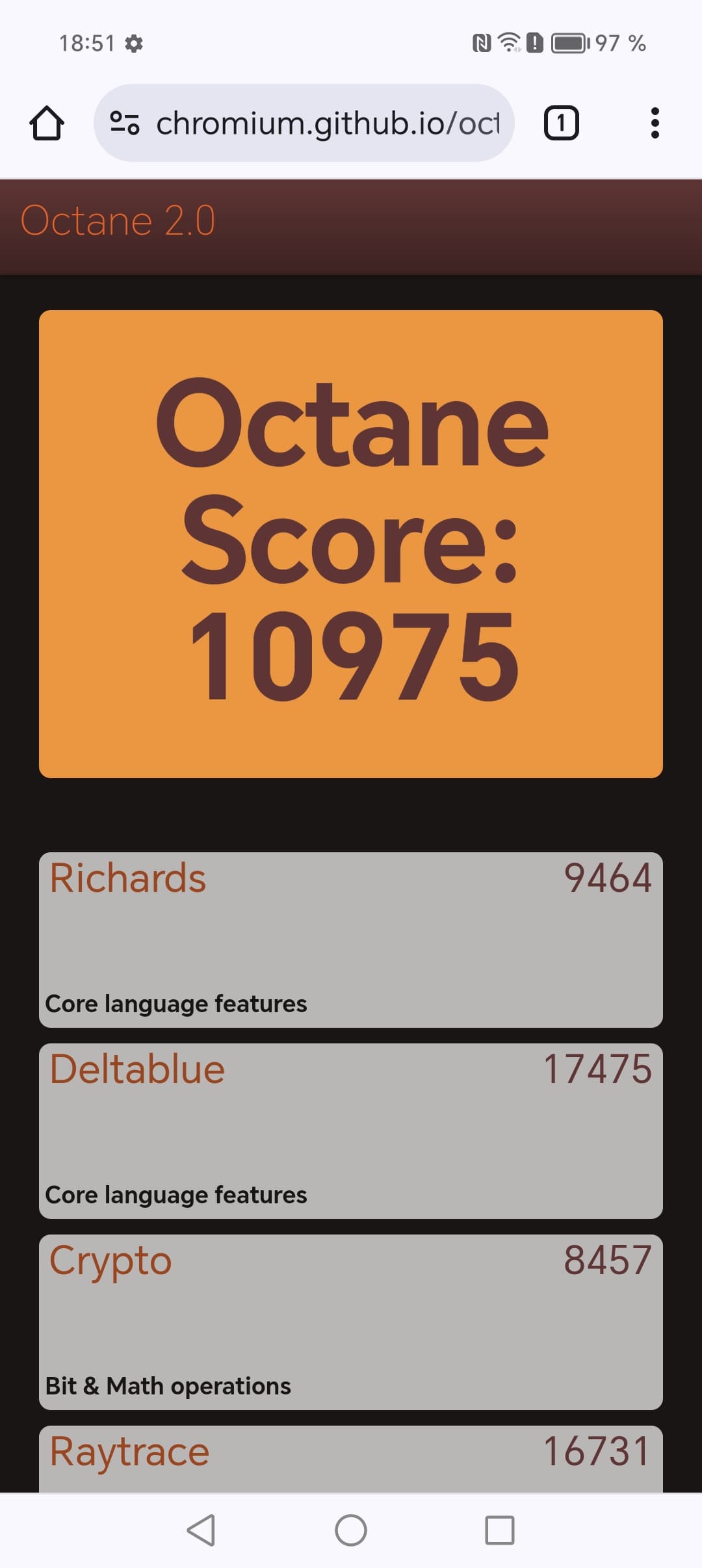 | Google Octane 2 (больше — лучше) | 10975 | 18851 | 29329 | 27070 | 19194 |