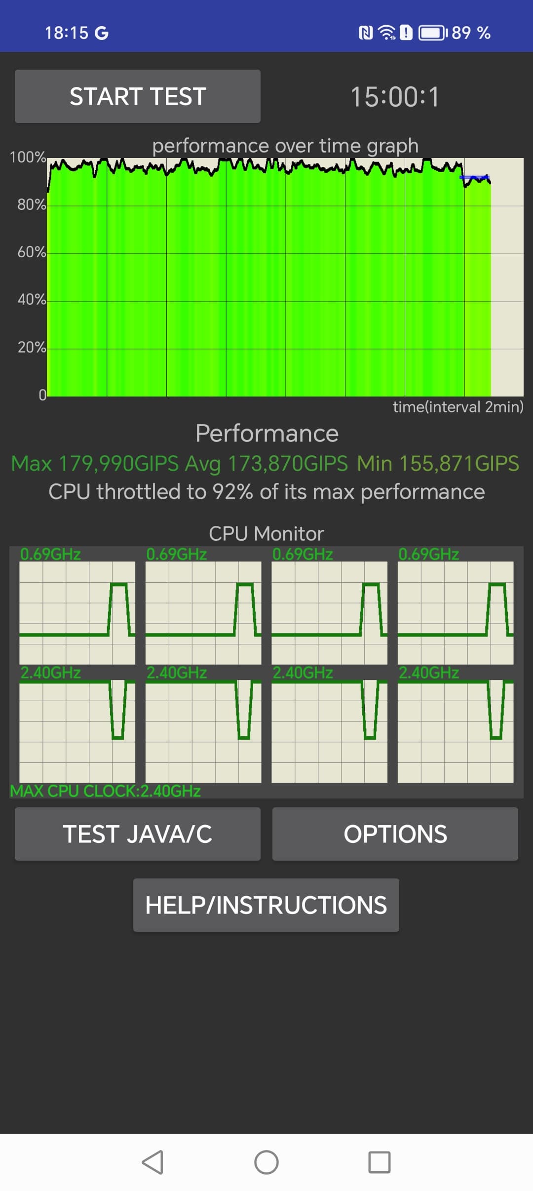Тест на снижение производительности при нагреве демонстрирует незначительное снижение производительности из-за перегрева под большой нагрузкой.