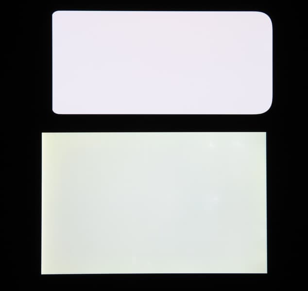 Экран характеризуется великолепными углами обзора. Даже белый цвет при отклонении на большие углы оттенок практически не приобретает, что в случае OLED встречается нечасто. Черный цвет остается просто черным под любыми углами. Он настолько черный, что параметр контрастности в данном случае неприменим. Для сравнения приведем фотографии, на которых на экраны смартфона и второго участника сравнения выведены одинаковые изображения, при этом яркость экранов изначально установлена примерно на 200 кд/м², а цветовой баланс на фотоаппарате принудительно переключен на 6500 К.