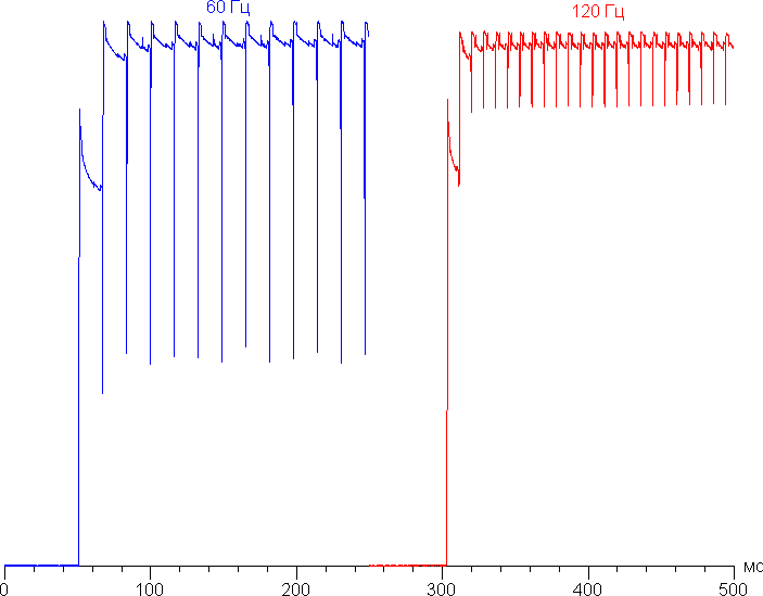 Видно, что основная частота модуляции увеличилась в 2 раза (относительно режима с 60 Гц). Видимого мерцания всё так же нет.