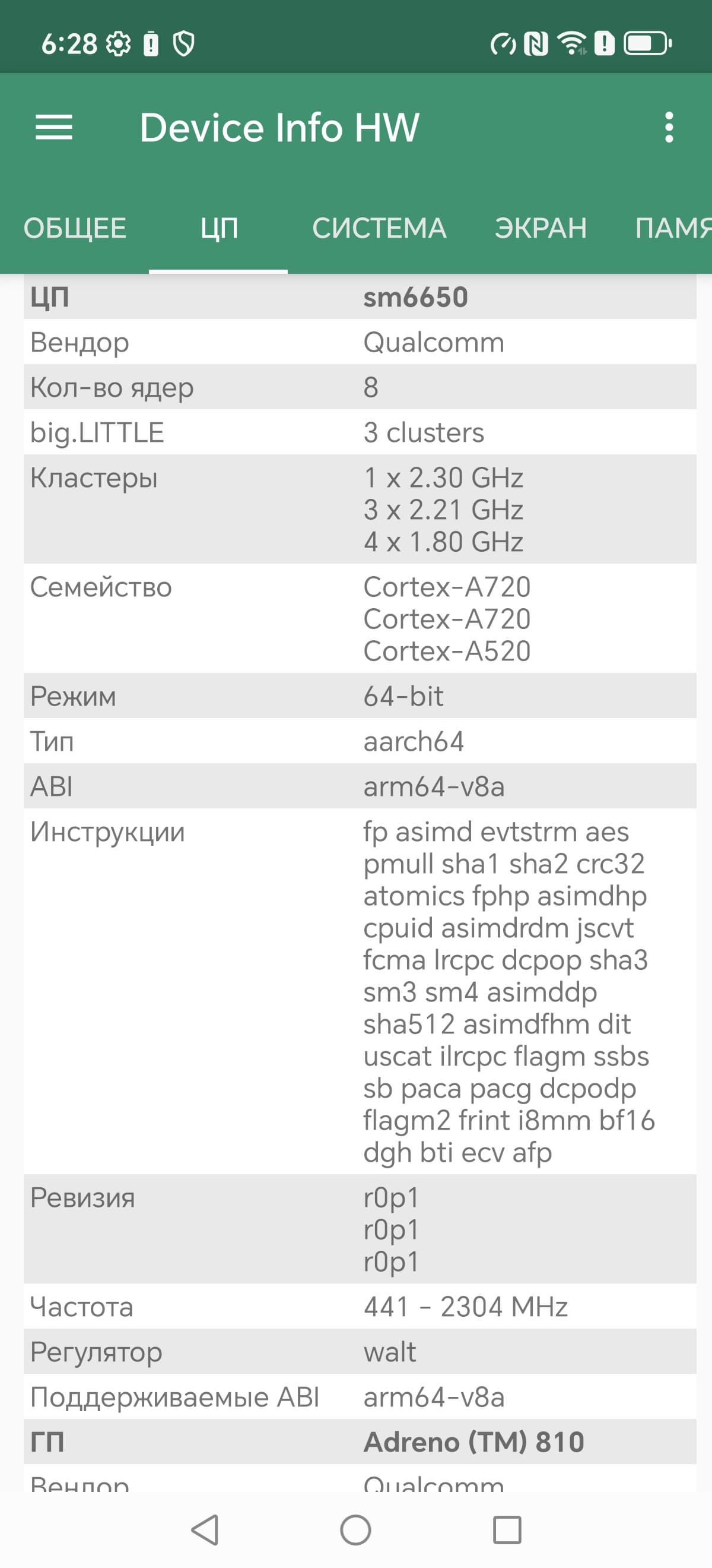 - SoC Qualcomm Snapdragon 6 Gen4, 8 процессорных ядер (1×Cortex-A720s @2,3 ГГц + 3×Cortex-A720s @2,2 ГГц + 4×Cortex-A520s @1,8 ГГц)