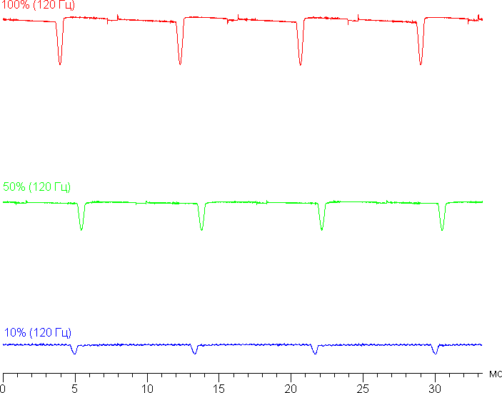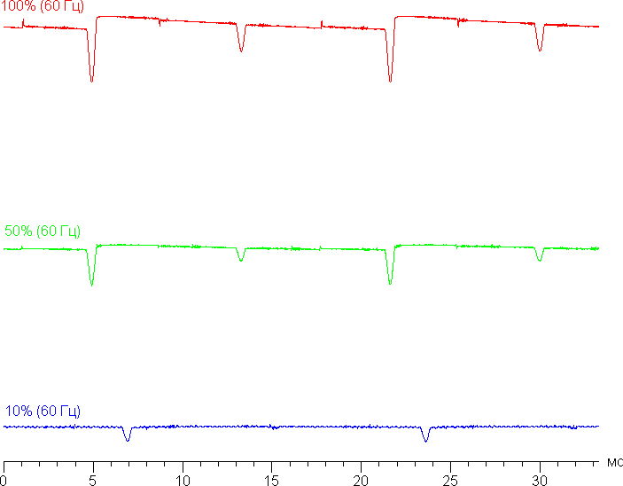 На любом уровне яркости присутствует значимая модуляция с частотой 60 или 120 Гц. На рисунках ниже приведены зависимости яркости (вертикальная ось) от времени (горизонтальная ось) для нескольких значений настройки яркости. Сначала для режима с частотой обновления 60 Гц: