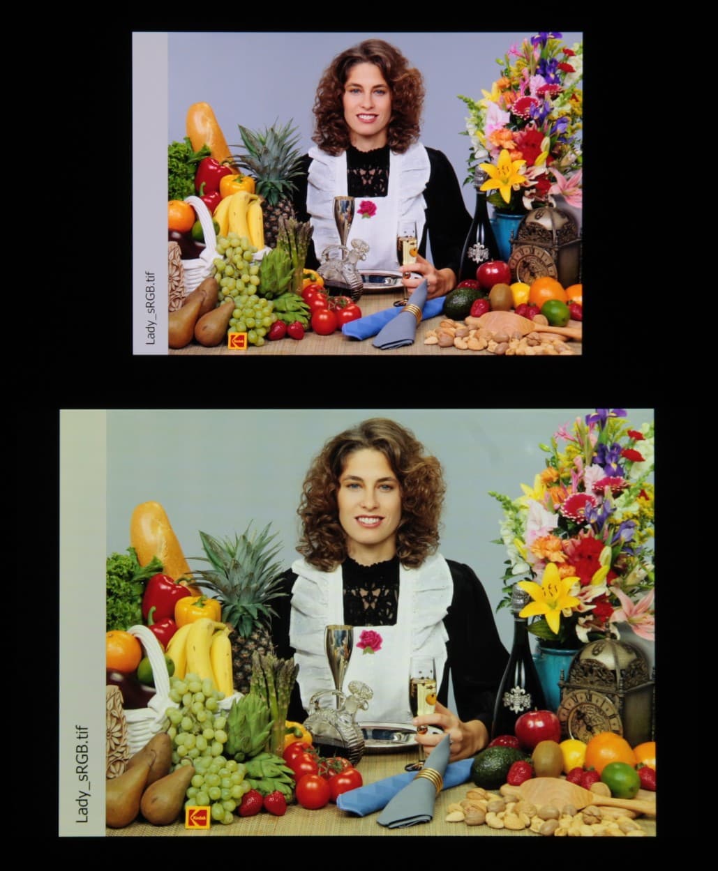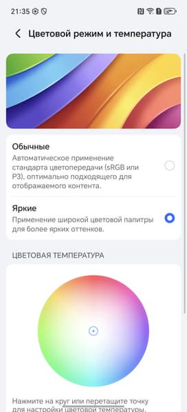 Отметим, что на экранах с уширенным цветовым охватом (без соответствующей коррекции) цвета́ обычных изображений, оптимизированных для устройств sRGB, выглядят неестественно насыщенными. Отсюда и рекомендация: в большинстве случаев смотреть кино, фотографии и все естественное лучше при выборе профиля Обычные. При этом, если в изображении прописан отличный от sRGB профиль, то смотреть его лучше с использованием штатной программы Галерея.
