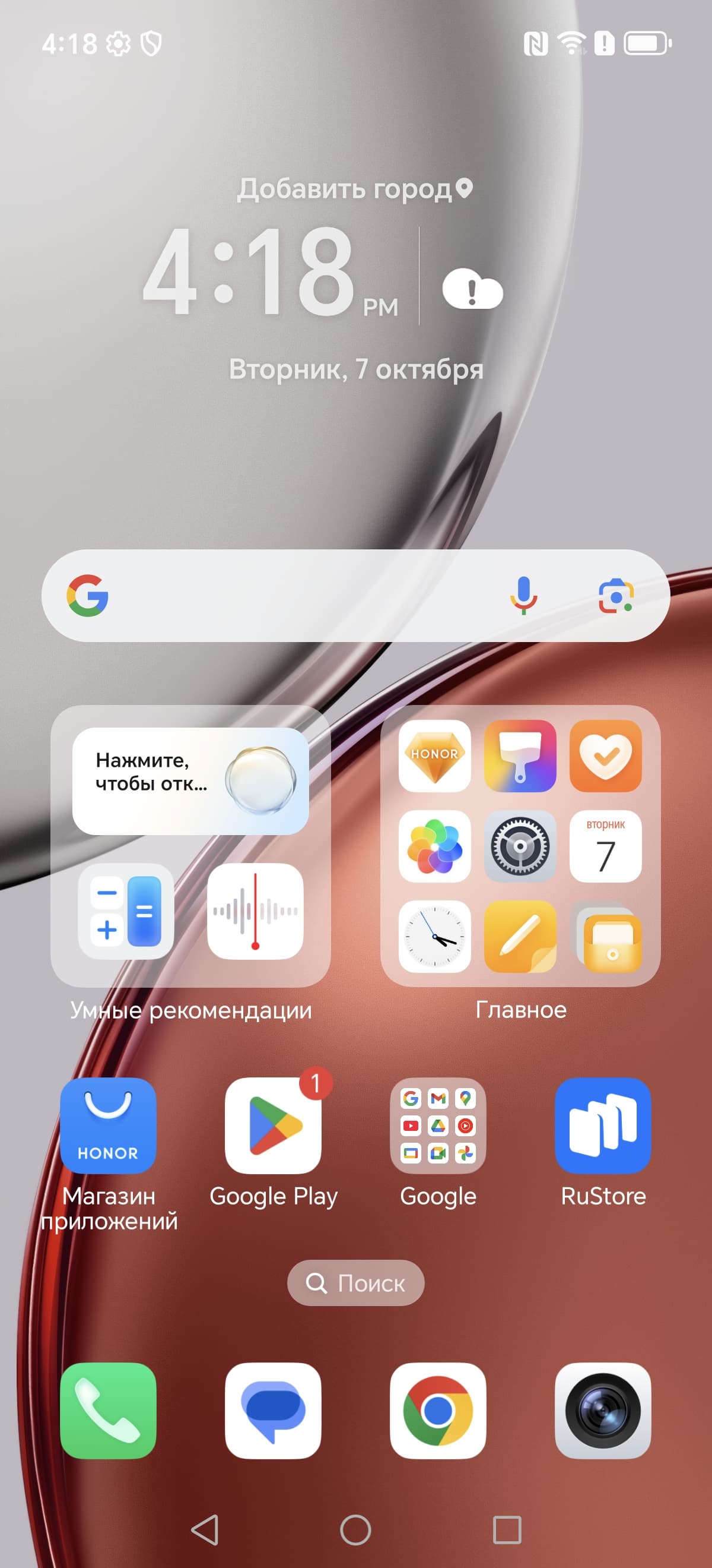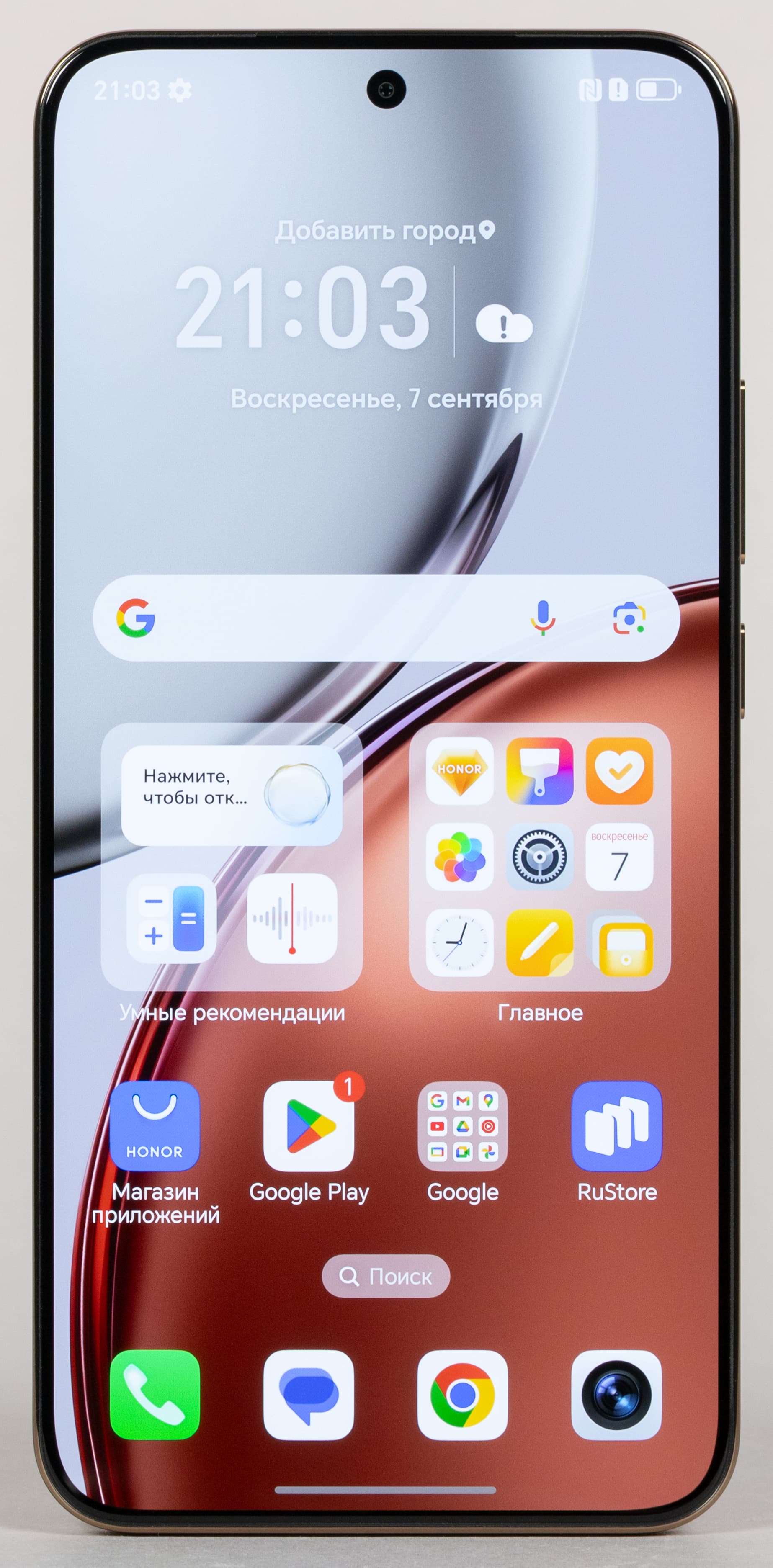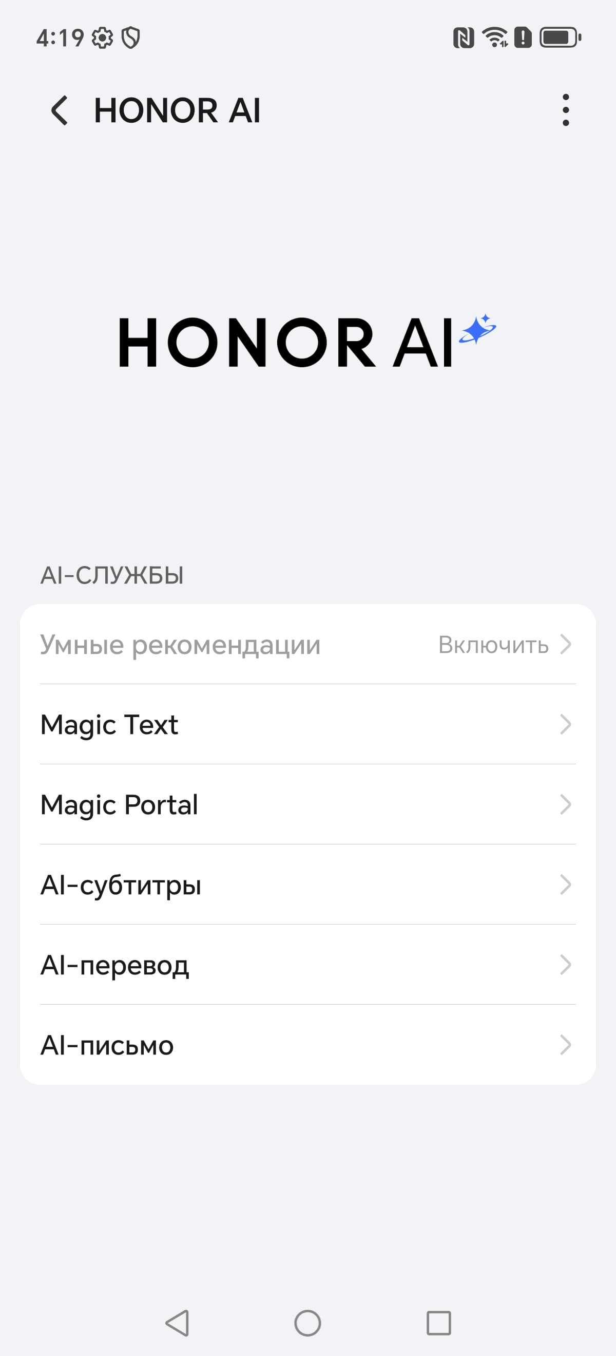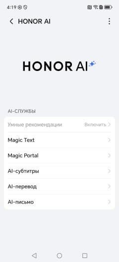 В качестве программной платформы смартфон основывается на ОС Android 15 с фирменной оболочкой MagicOS 9. К этой части претензий нет совсем. Интерфейс у Honor идеально оптимизирован, четко и понятно организован, имеет массу облегчающих жизнь функций, в том числе, на основе ИИ-алгоритмов. Все они собраны здесь в единый раздел Honor AI (для перевода телефонных разговоров «на ходу», для расшифровки аудиозаписей, для умной работы с вебстраницами и широкими возможностями редактирования, доработки текстов. Верхняя шторка разделена на две части в зависимости от места оттягивания. Есть полноценная поддержка сервисов Google и магазин Google Play Store.