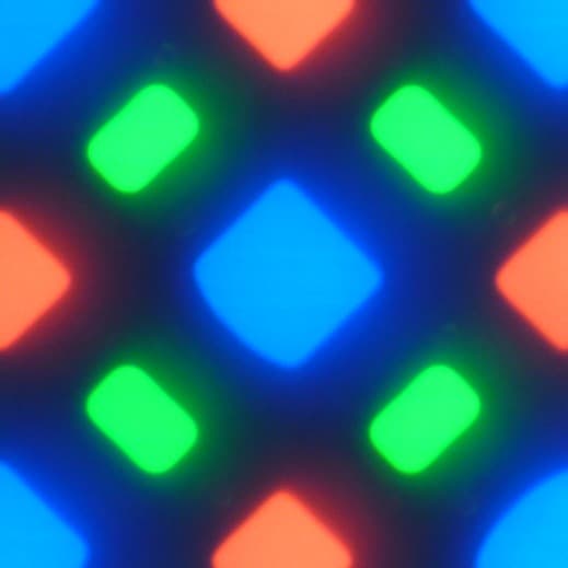 В этом экране используется матрица AMOLED — активная матрица на органических светодиодах. Полноцветное изображение создается с помощью субпикселей трех цветов — красного (R), зеленого (G) и синего (B), но красных и синих субпикселей в два раза меньше, что можно обозначить как RGBG. Это подтверждается фрагментом микрофотографии: