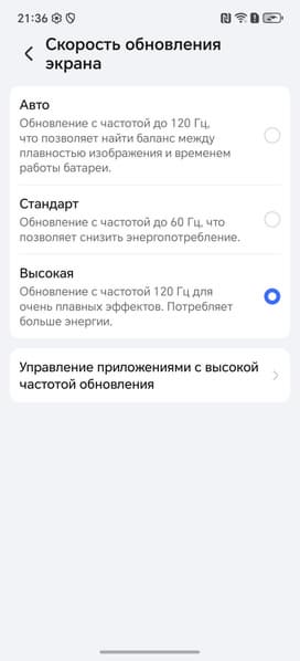 В настройках экрана можно включить режим с повышенной до 120 Гц частотой обновления: