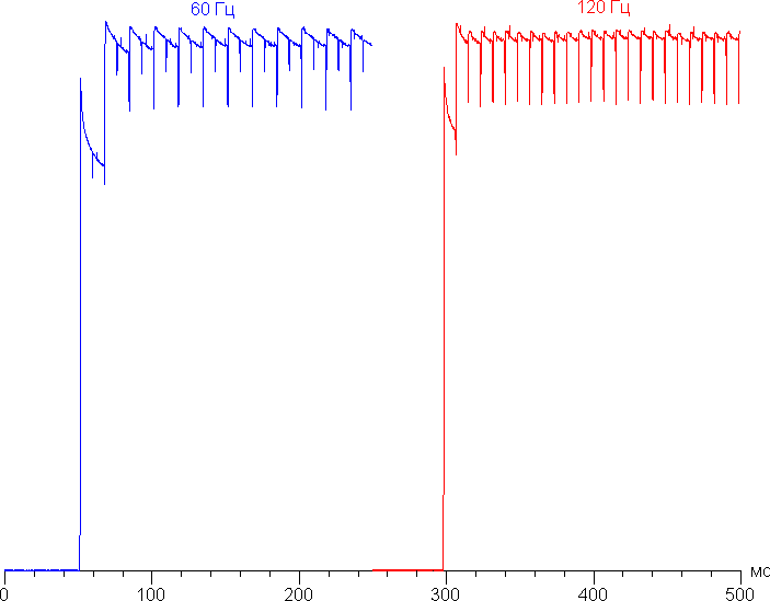 В эти режимах плавность прокрутки (списков в меню и т.д.) заметно повышается. Посмотрим, изменится ли при этом характер модуляции. Режим с частотой обновления 120 Гц: