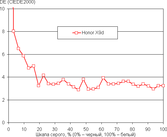 Напомним, что в случае OLED-экранов яркость фрагментов изображения динамично меняется в соответствии с характером выводимого изображения — чуть уменьшается для светлых в целом изображений. В итоге полученная зависимость яркости от оттенка (гамма-кривая), скорее всего, не соответствует гамма-кривой статичного изображения, так как измерения проводились при последовательном выводе оттенков серого почти на весь экран.