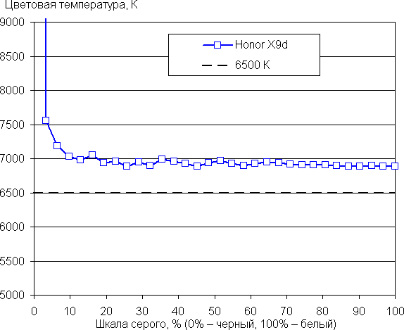 Впрочем, в случае профиля Обычные даже без коррекции баланс оттенков на шкале серого хороший, так как цветовая температура достаточно близка к стандартным 6500 К, и отклонение от спектра абсолютно черного тела (ΔE) ниже 10, что для потребительского устройства считается хорошим показателем. При этом цветовая температура и ΔE мало изменяются от оттенка к оттенку — это положительно сказывается на визуальной оценке цветового баланса. (Самые темные области шкалы серого можно не учитывать, так как там баланс цветов не имеет большого значения, да и погрешность измерений цветовых характеристик на низкой яркости большая.)