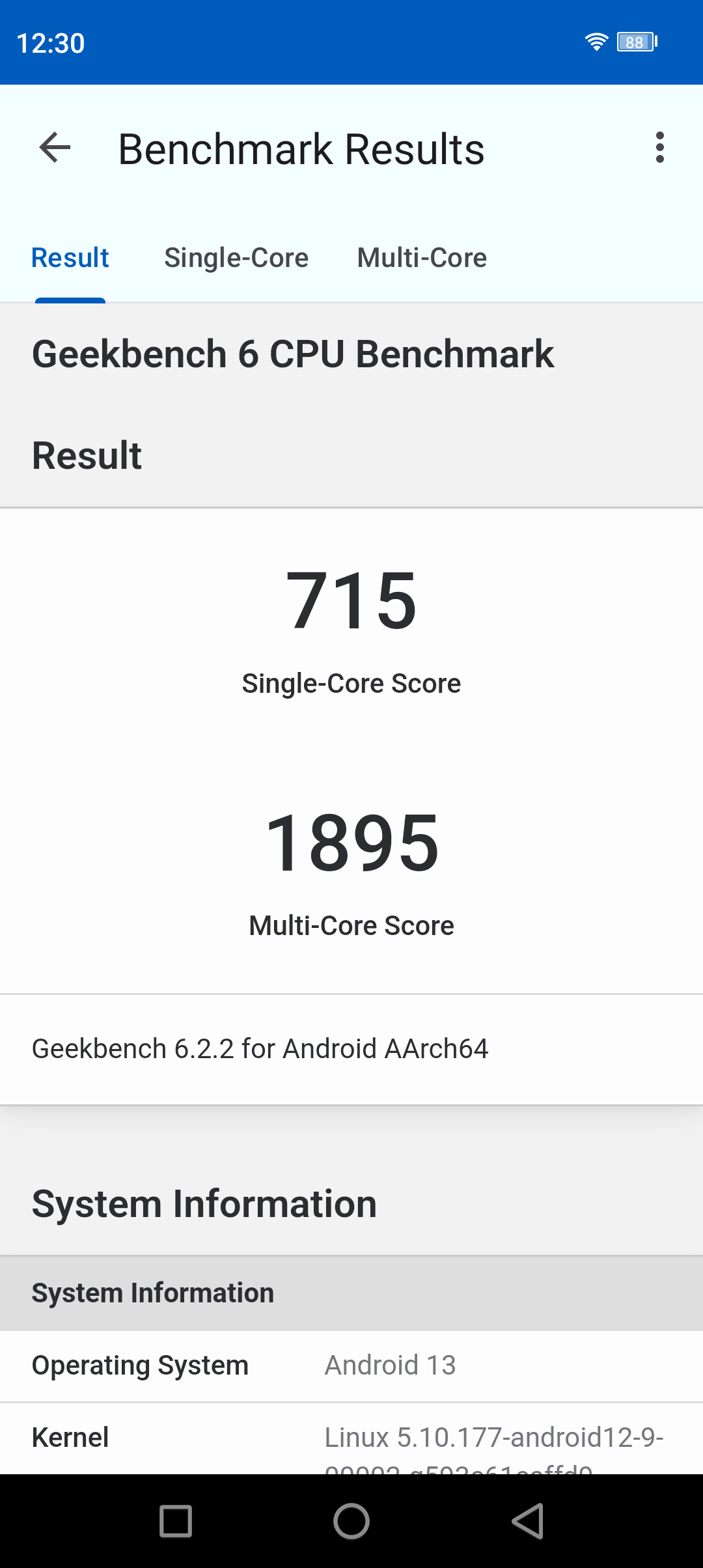 Платформа Mediatek Helio G99 — двухлетняя, анонсирована 23 мая 2022 года и изготовляется по 6-нанометровому техпроцессу. Она демонстрирует невысокую производительность, это практически начальный уровень по теперешним меркам: смартфон набирает в AnTuTu менее 400 тысяч баллов. Впрочем, интерфейс работает бойко, но не плавно, а, наоборот, довольно резко. Приложения устанавливаются долго. Производительности хватает для работы основных приложений, но запись 4К-видео и видео с 60 fps, не говоря уже о требовательных играх, смартфон не тянет.