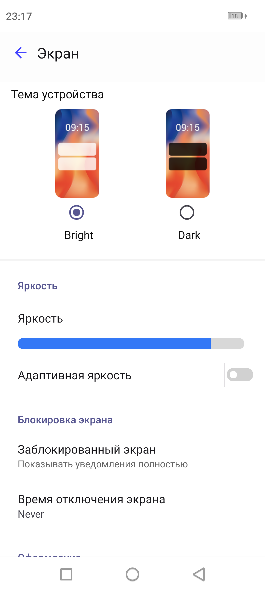 При выводе белого поля во весь экран и при ручном управлении яркостью ее максимальное значение составило 490 кд/м². Максимальная яркость не очень высокая, но, учитывая отличные антибликовые свойства, что-то на экране можно будет разобрать даже в солнечный день вне помещения. Минимальное значение яркости — 20 кд/м². В полной темноте яркость можно понизить до комфортного значения. В наличии автоматическая регулировка яркости по датчику освещенности (он находится слева от решетки фронтального громкоговорителя, близко к верхнему краю фронтальной панели). В автоматическом режиме при изменении внешних условий освещенности яркость экрана как повышается, так и понижается. Работа этой функции зависит от положения ползунка регулировки яркости: им пользователь может попытаться выставить желаемый уровень яркости в текущих условиях. Если не вмешиваться, то в полной темноте функция автояркости уменьшает яркость до 20 кд/м² (нормально), в условиях освещенного искусственным светом офиса (примерно 550 лк) устанавливает на 490 кд/м² (излишне ярко), а условно под прямыми лучами солнца повышает до 490 кд/м² (до максимума). Результат нас не совсем устроил, поэтому в условиях офиса мы снизили яркость, но при этом снизилась яркость и на ярком свету, что неприемлемо. Получается, что функция автоподстройки яркости работает не совсем адекватно, а, судя по выдаваемым значениям, причиной является завышенные показания датчика освещенности. На любом уровне яркости значимая модуляция подсветки отсутствует, поэтому нет и никакого мерцания экрана.