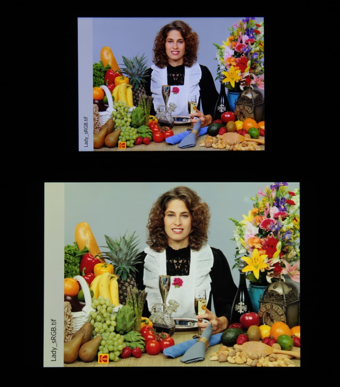 Баланс оттенков на шкале серого средний, так как цветовая температура существенно выше стандартных 6500 К, но отклонение от спектра абсолютно черного тела (ΔE) относительно невысокое, ниже 10 единиц. Впрочем цветовая температура и ΔE мало изменяются от оттенка к оттенку — это положительно сказывается на визуальной оценке цветового баланса. (Самые темные области шкалы серого можно не учитывать, так как там баланс цветов не имеет большого значения, да и погрешность измерений цветовых характеристик на низкой яркости большая.)