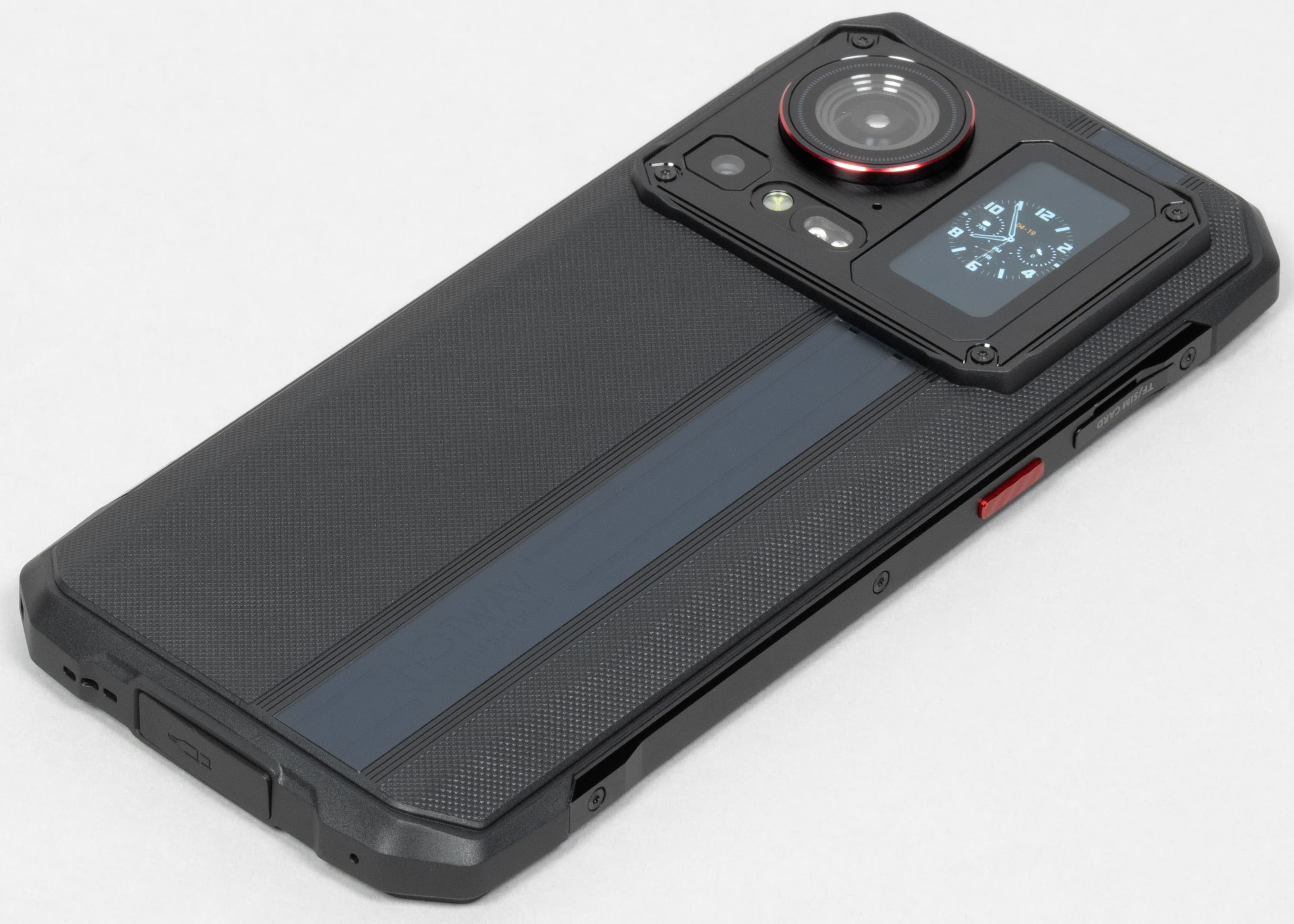 Сзади в едином блоке, тоже зачем-то прикрученном винтиками, помимо основной и дополнительной камеры со вспышкой расположен также дополнительный сенсорный экран — цветной и с собственным набором циферблатов. Он отображает входящие уведомления о звонках и сообщениях из приложений вроде WhatsApp и Telegram, предоставляет быстрый доступ к функциям управления камерой и музыкальными приложениями. Также он может демонстрировать информацию о заряде батареи и количестве пройденных шагов. Официально для этого экрана заявлено разрешение 240×240, хотя хорошо видно, что на самом деле он сильно вытянутый.