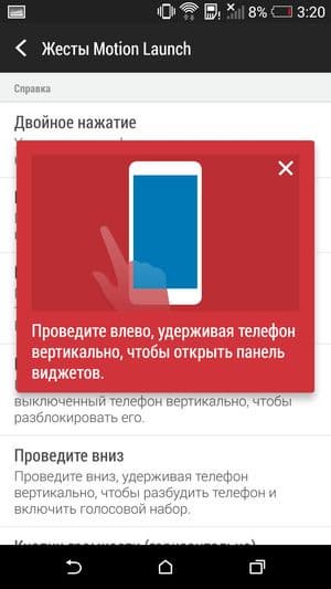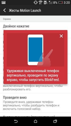 Насчет жестов стоит заметить, что их здесь используется очень много, и если запомнить, что, куда и в какой последовательности смахивается, то это реально может сэкономить время. Например, даже если взять простое разблокирование смахивающим жестом по выключенному экрану, то в зависимости от четырех из возможных направлений смахивания жест будет отрабатывать и разные задачи: либо сразу всплывет новостная лента BlinkFeed, либо произойдет автоматический переход к голосовому набору, либо откроется рабочий стол с виджетами, и т. д. Бо́льшая часть настроек для работы с жестами находится в разделе меню под названием Motion Launch.