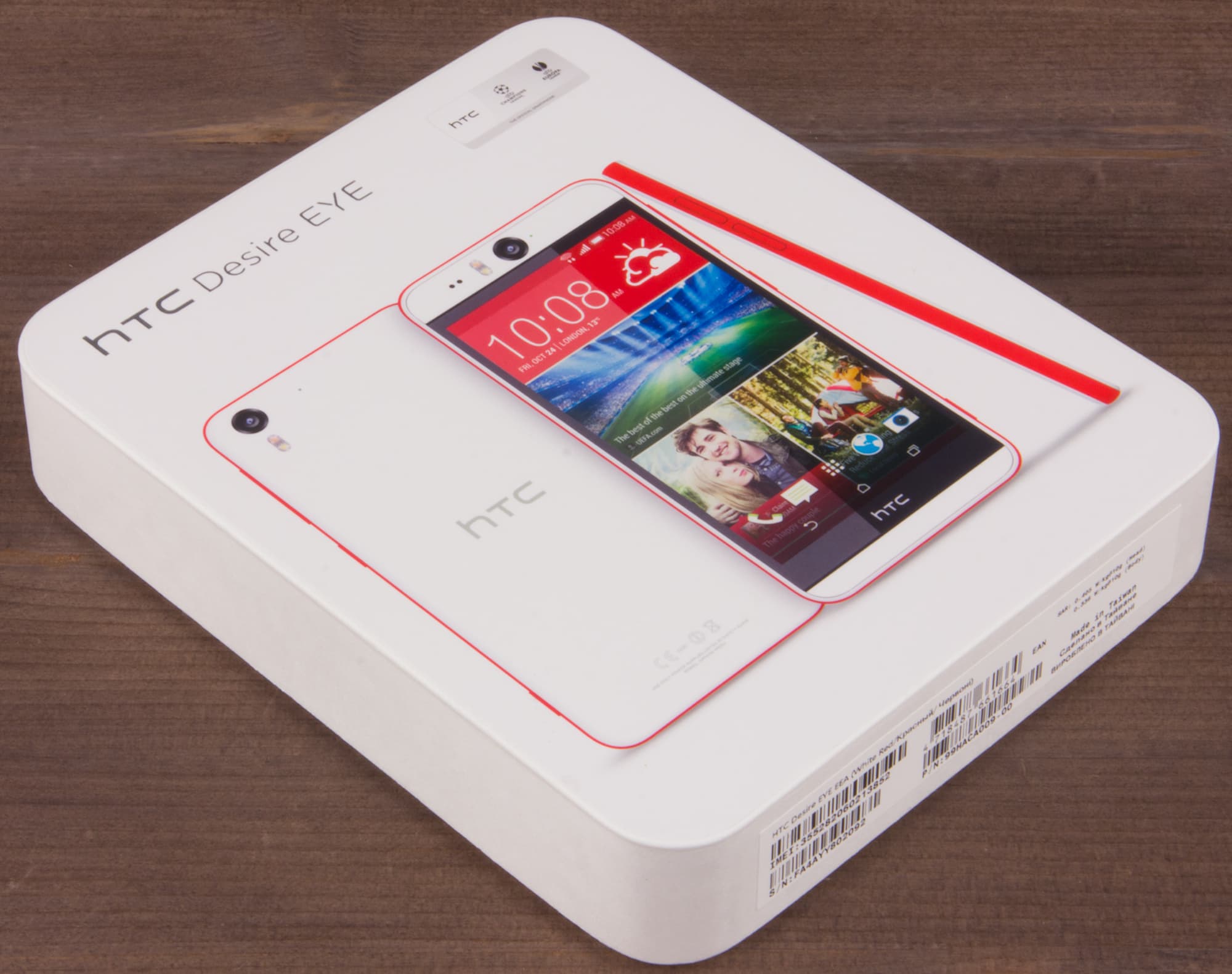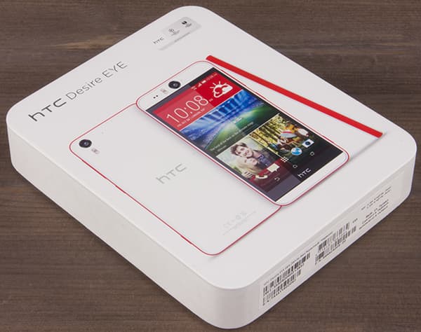 Смартфон HTC Desire Eye поставляется в продажу в точно такой же упаковке, как и все предыдущие топовые продукты данной марки. Квадратная и плоская картонная коробочка с закругленными углами, как всегда, экологична: она целиком произведена из возобновляемых материалов, а для краски используются соевые чернила. Коробка достаточно аккуратная и в чем-то стильная, однако открывать ее совсем неудобно: верхняя крышка целиком накрывает собой весь нижний поддон, поэтому пальцам тут зацепиться не за что, приходится трясти коробку и просовывать пальцы в щели между крышкой и основанием, что выглядит для премиального продукта достаточно нелепо. Очевидно, задумка такова, что коробку нужно просто уничтожать при вскрытии, а не сберегать.