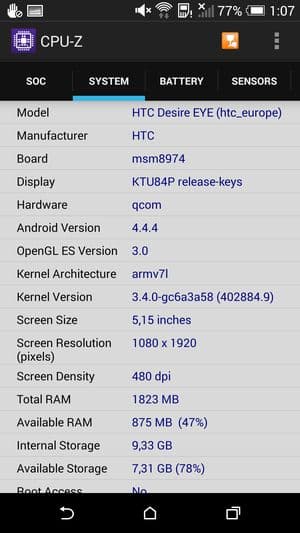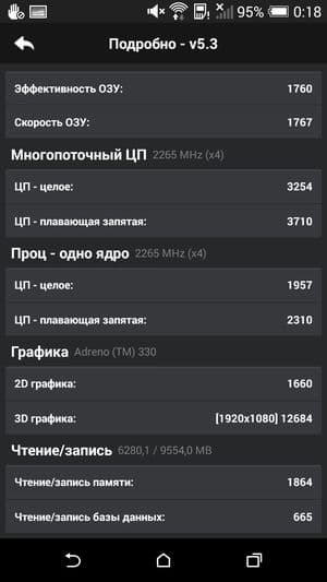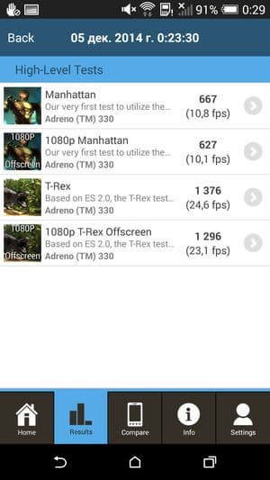 По результатам тестирования в бенчмарках смартфон с версией платформы Qualcomm Snapdragon 801 MSM8974AB ожидаемо и логично немного уступил максимальной версии MSM8974AС, у которой более высокая частота процессорных ядер и GPU (на примере сравнения с Sony Xperia Z3). Что же касается конкурирующих платформ, то в сравнении с новейшей восьмиядерной MediaTek MT6595 (представленной в сравнительной таблице моделями Meizu MX4 и Lenovo Vibe X2) SoC Qualcomm уже не занимает лидирующие позиции. Даже более слабая версия Mediatek MT6595m обгоняет Snapdragon 801 как в комплексных тестах, так и в браузерных. Впрочем, графический ускоритель Adreno 330 в Snapdragon все еще находится на первом месте по производительности, его не догнал даже новейший PowerVR G6200, который входит в состав платформы MediaTek. Как бы то ни было, аппаратная начинка смартфона HTC Desire Eye безусловно достаточно производительная для того, чтобы справиться с любыми задачами, поставленными требовательными программами и тяжелыми 3D-играми.