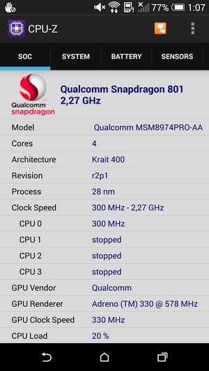 - SoC Qualcomm Snapdragon 801 (MSM8974AВ), 4 ядра Krait 400, 2,3 ГГц