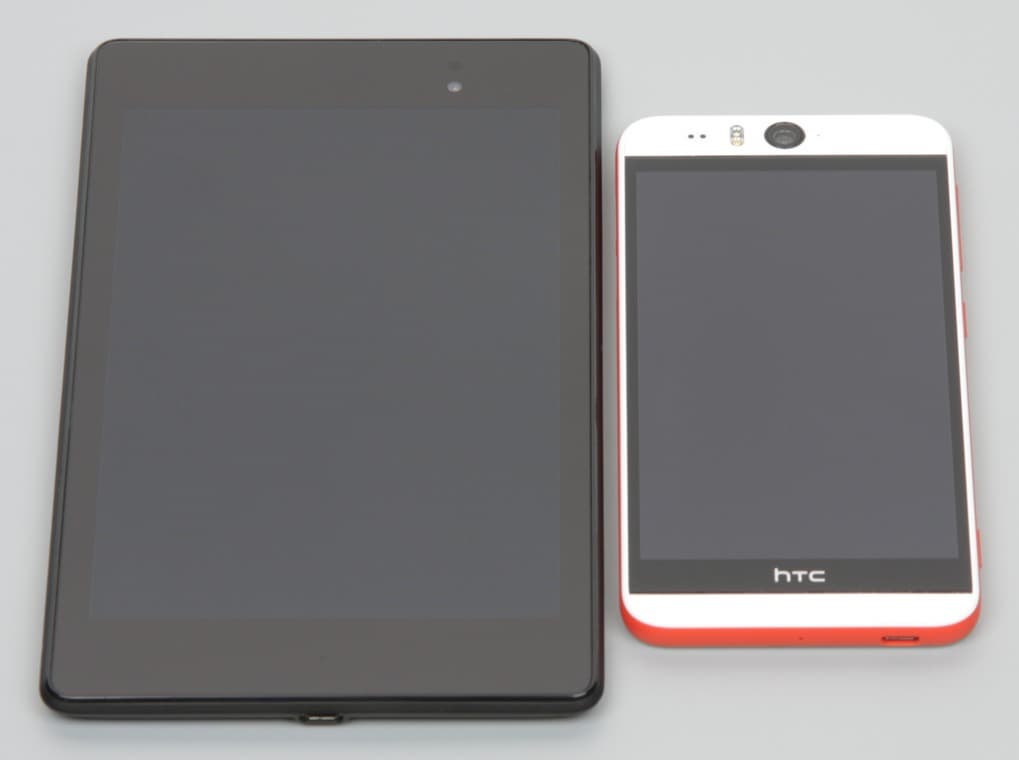 Лицевая поверхность экрана выполнена в виде стеклянной пластины с зеркально-гладкой поверхностью, устойчивой к появлению царапин. Судя по отражению объектов антибликовые свойства экрана не хуже, чем у экрана Google Nexus 7 (2013) (далее просто Nexus 7). Для наглядности приведем фотографию, на которой в выключенных экранах отражается белая поверхность (слева — Nexus 7, справа — HTC Desire Eye, далее их можно различать по размеру):