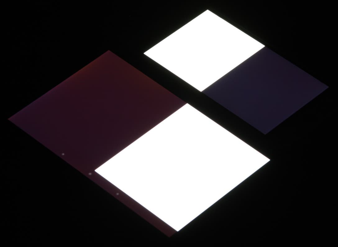 Яркость под углом у экранов уменьшилась (как минимум в 5 раз, исходя из разницы в выдержке), но в случае HTC Desire Eye падение яркости меньше. Черное поле при отклонении по диагонали высветляется слабо и приобретает фиолетовый или красно-фиолетовый оттенок. Фотографии ниже это демонстрируют (яркость белых участков в перпендикулярном плоскости экранов направлении примерно одинаковая!):
