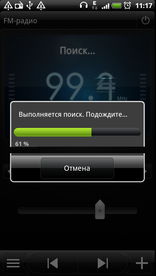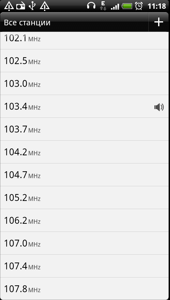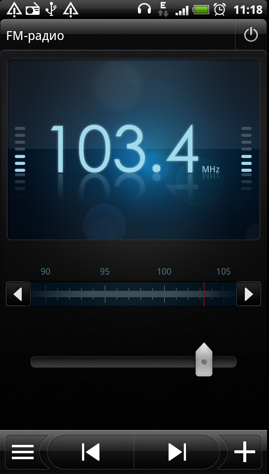 Встроенный радиоприемник FM-диапазона функционирует только при подключенных наушниках. При первом запуске программа сканирует частотный диапазон и сохраняет в память список найденных радиостанций. В дальнейшем его можно изменить, добавив или удалив записи, вручную указывая частоту станции. Управление программой простое и удобное, качество приема приемлемое.