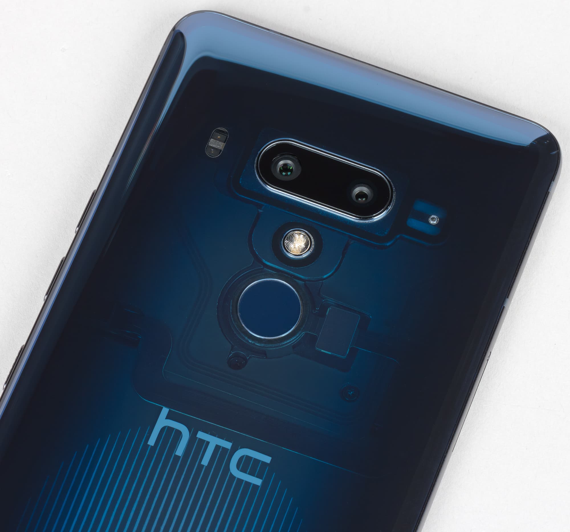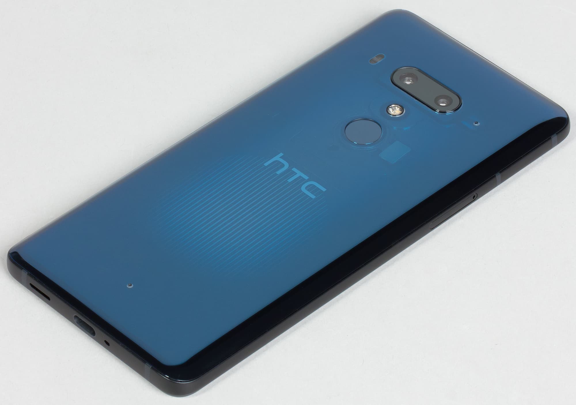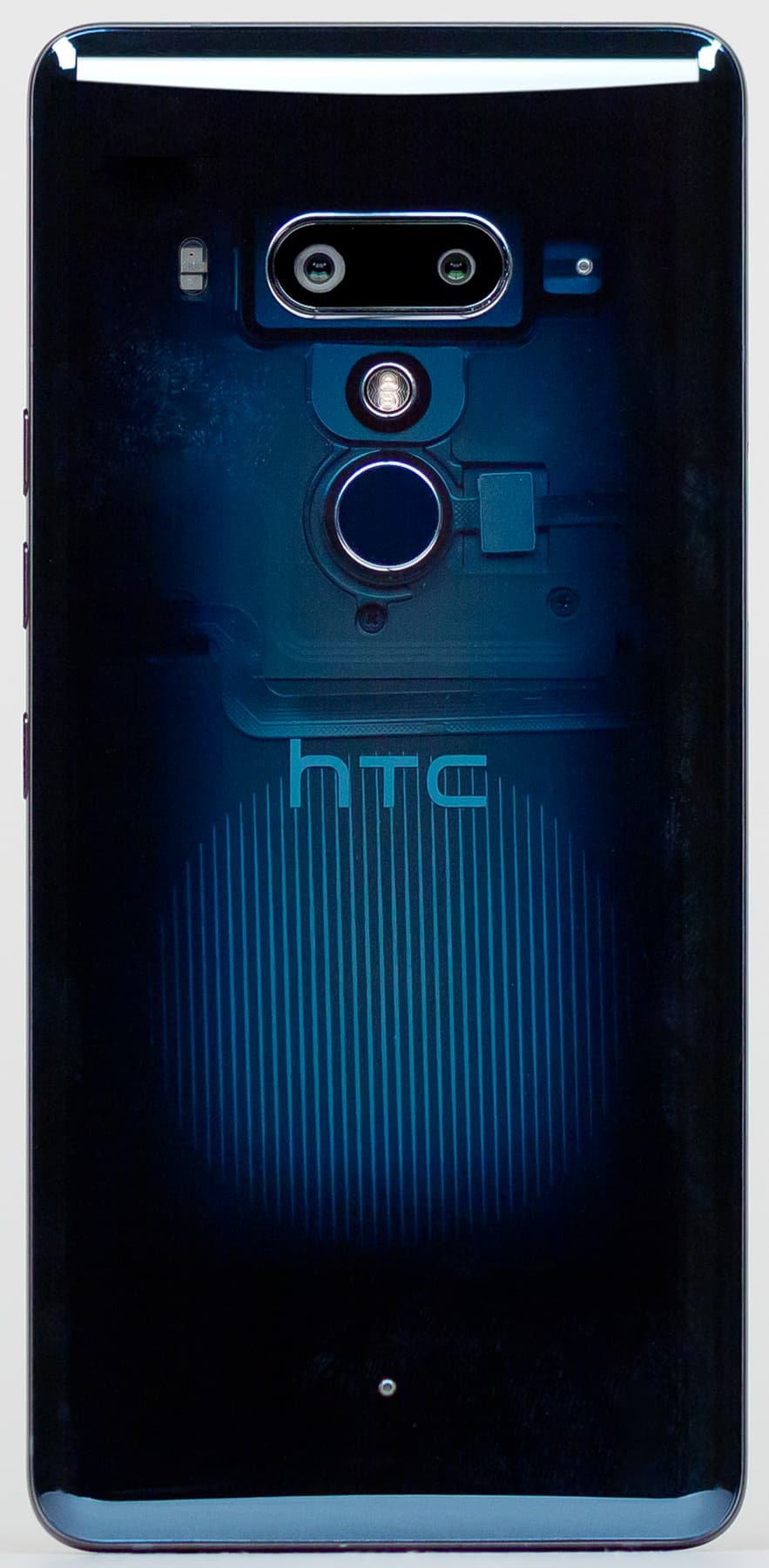 HTC U12+ получил весьма своеобразный дизайн, основной отличительной чертой которого стала прозрачная задняя стенка, выполненная из стекла. Сами создатели называют это «переливающимся дизайном», поскольку у стекла имеется полупрозрачная зеркальная подложка, которая действительно эффектно бликует в лучах света.