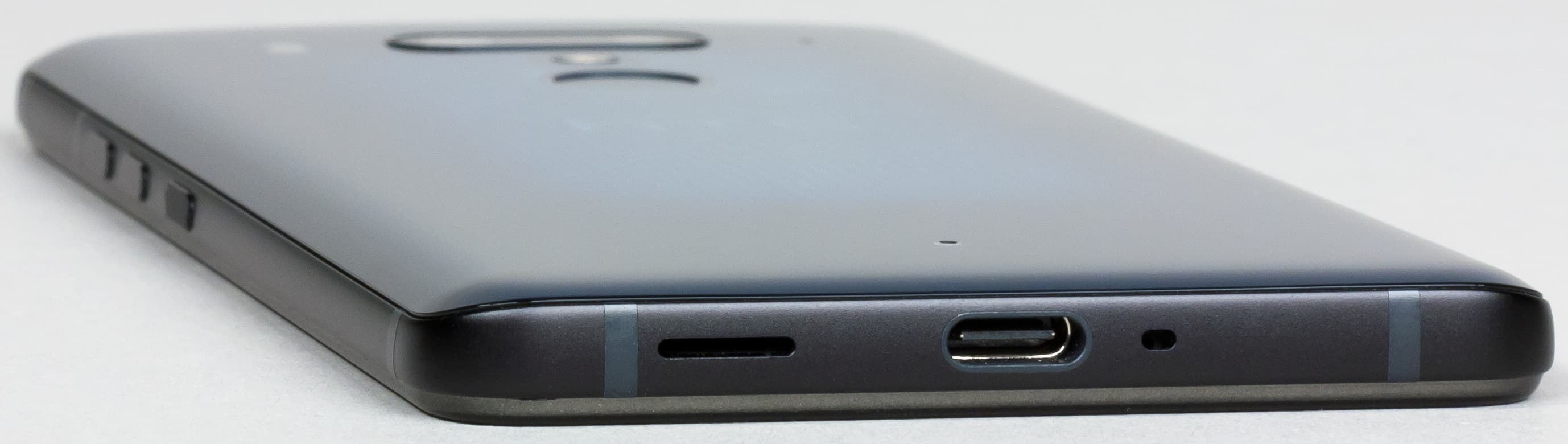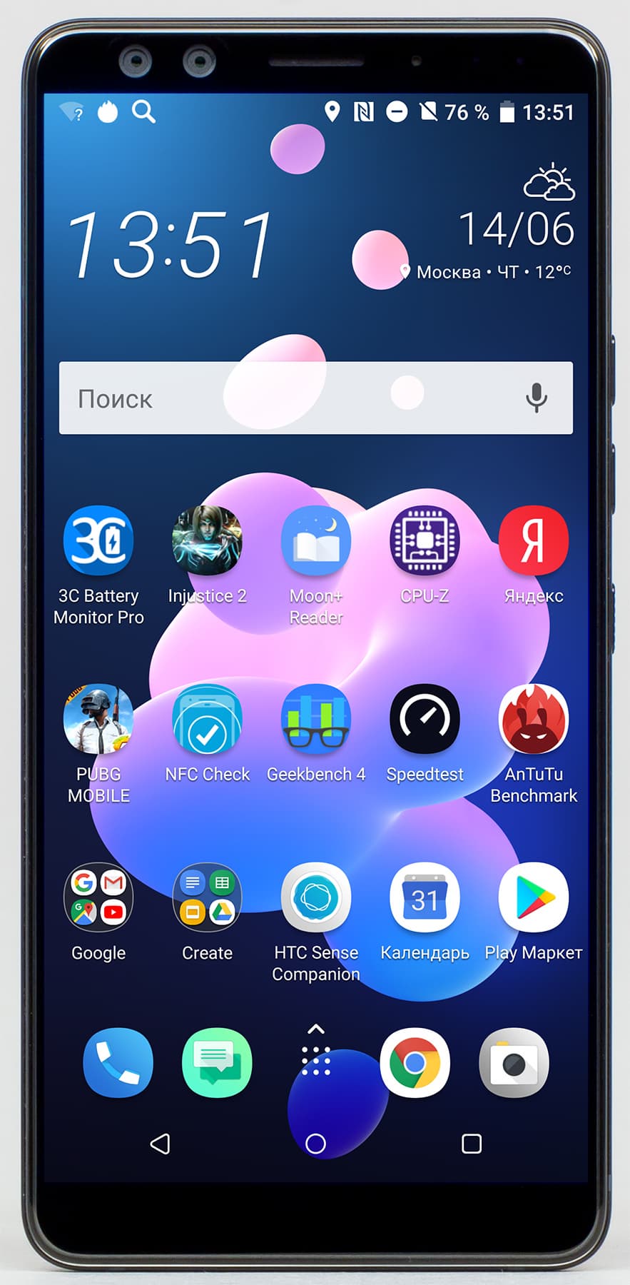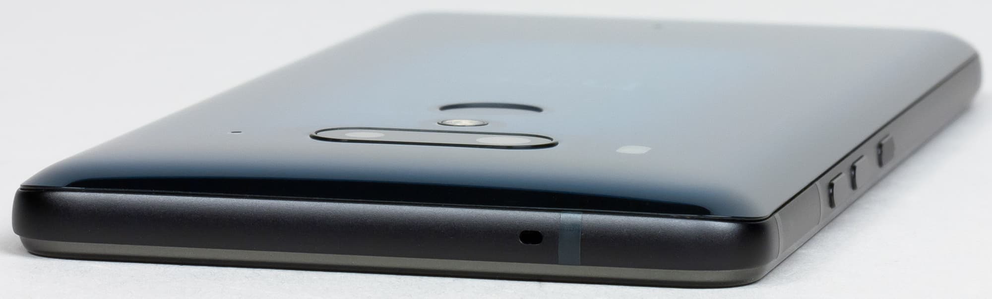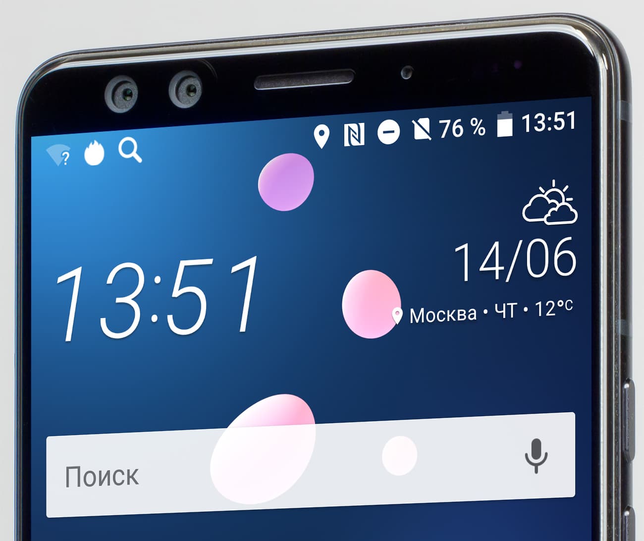 На передней панели присутствуют два глазка фронтальной камеры (так что HTC U12+ можно назвать «четырехкамерным»). Над экраном врезали привычный светодиодный индикатор событий, и это странно: все ожидали какого-нибудь светового датчика оповещения, помещенного под заднюю прозрачную стенку, это было бы оправданно.