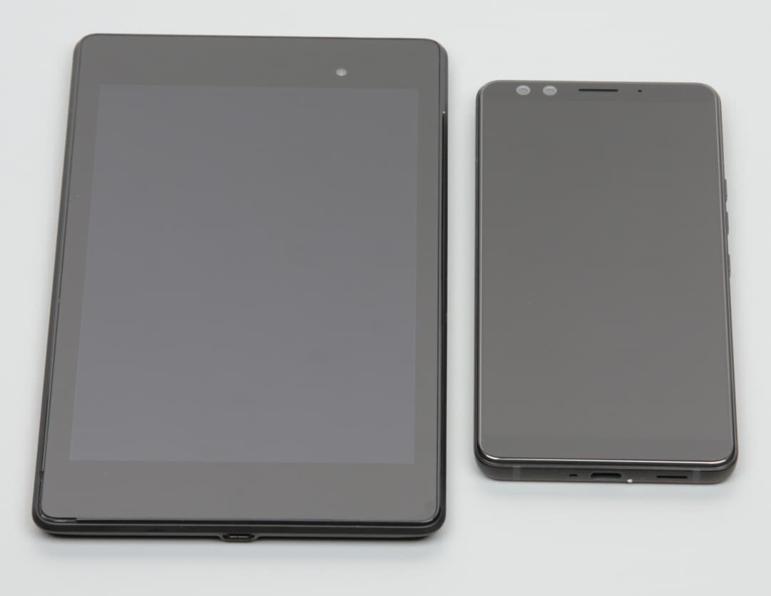 Лицевая поверхность экрана выполнена в виде стеклянной пластины с зеркально-гладкой поверхностью, устойчивой к появлению царапин. Судя по отражению объектов, антибликовые свойства экрана немного лучше, чем у экрана Google Nexus 7 (2013) (далее просто Nexus 7). Для наглядности приведем фотографию, на которой в выключенных экранах отражается белая поверхность (слева — Nexus 7, справа — HTC U12+, далее их можно различать по размеру):