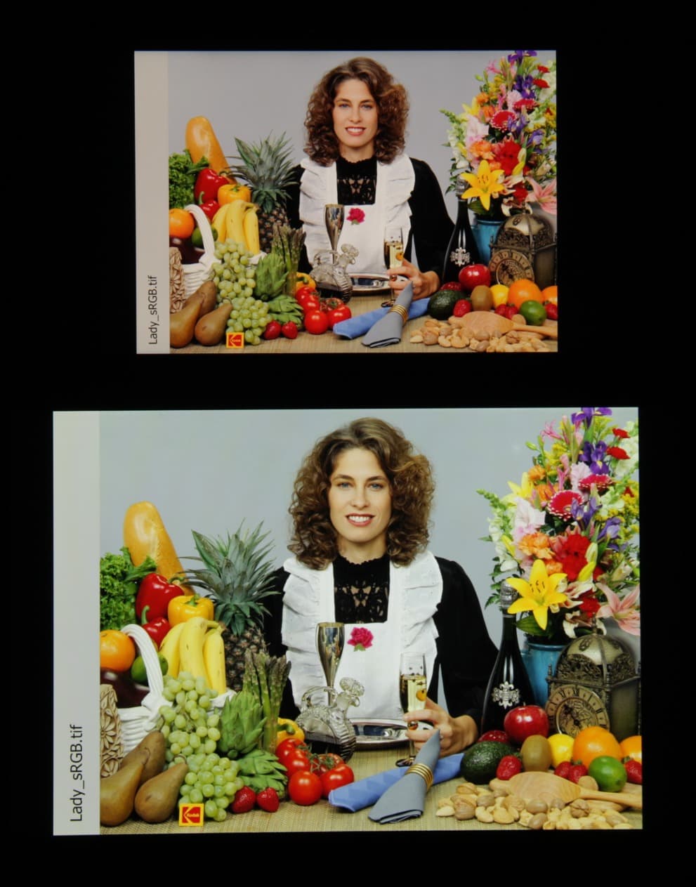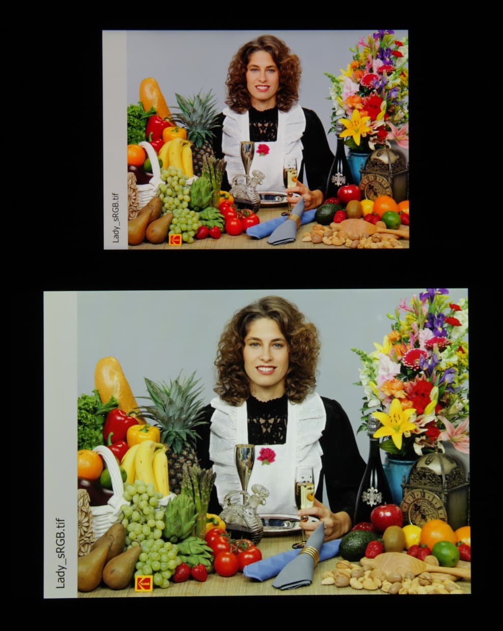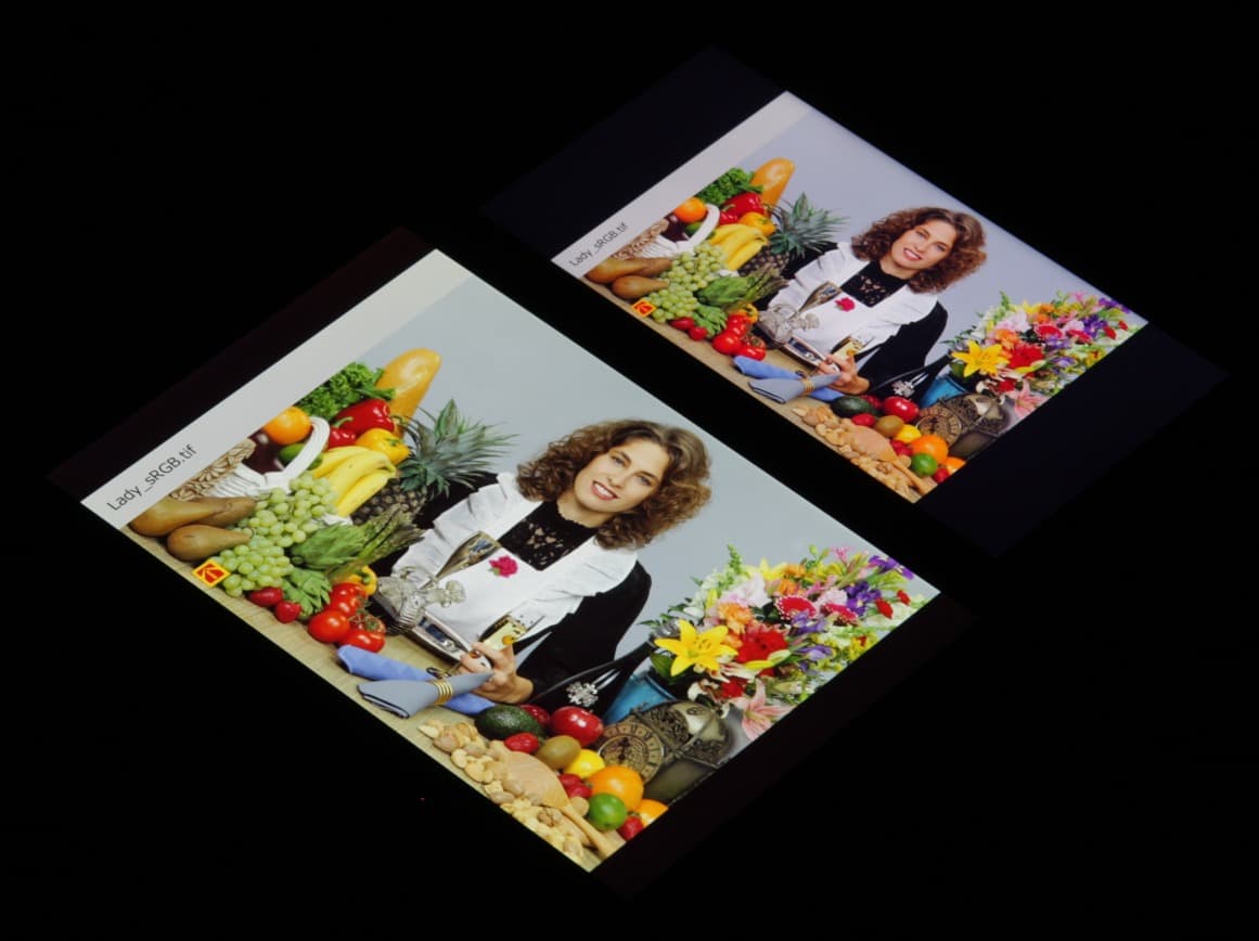 Спектры компонент хорошо разделены, что и обуславливает широкий цветовой охват. Такое мы уже видели в случае, например, Sony Xperia Z2 и других мобильных устройств. Sony указывает, что в этих экранах используются светодиоды с синим излучателем и зеленым и красным люминофором (обычно — синий излучатель и желтый люминофор), что в сочетании со специальными светофильтрами матрицы и позволяет получить широкий цветовой охват. Да, и в красном люминофоре, видимо, используются так называемые квантовые точки. Для потребительского устройства широкий цветовой охват является никак не достоинством, а существенным недостатком, поскольку в итоге цвета изображений — рисунков, фотографий и фильмов, — ориентированных на пространство sRGB (а таких подавляющее большинство), имеют неестественную насыщенность. Особенно это заметно на узнаваемых оттенках, например на оттенках кожи. Результат приведен на фотографиях выше.