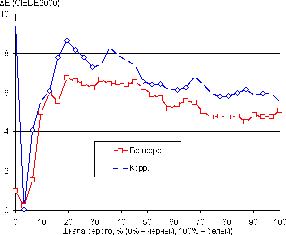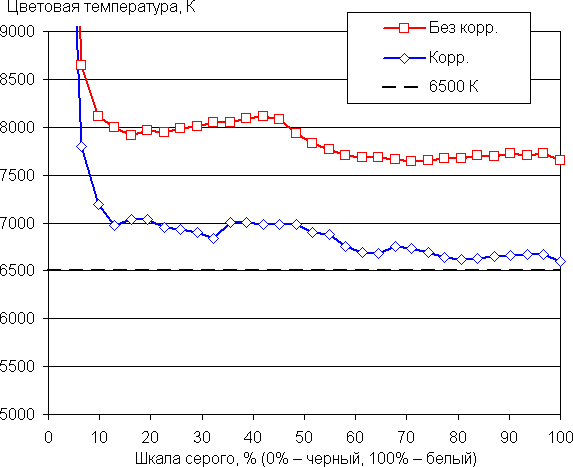 Баланс оттенков на шкале компромиссный, так как цветовая температура существенно выше стандартных 6500 К, но отклонение от спектра абсолютно черного тела (ΔE) ниже 10, что для потребительского устройства считается приемлемым показателем. При этом цветовая температура и ΔE мало изменяются от оттенка к оттенку — это положительно сказывается на визуальной оценке цветового баланса. (Самые темные области шкалы серого можно не учитывать, так как там баланс цветов не имеет большого значения, да и погрешность измерений цветовых характеристик на низкой яркости большая.)