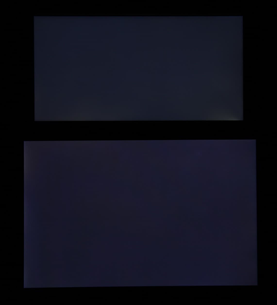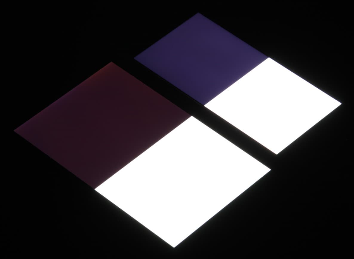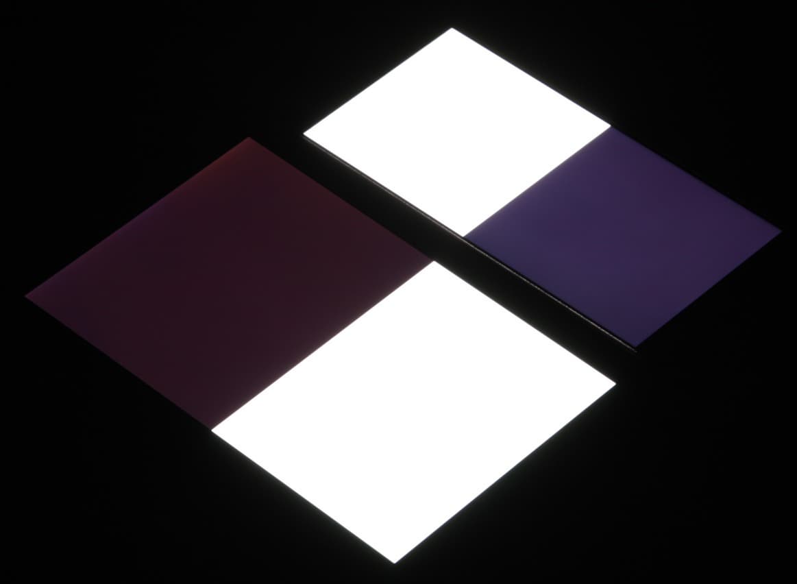 Яркость под углом у экранов уменьшилась (как минимум в 4 раза, исходя из разницы в выдержке), но у HTC U12+ экран все же немного светлее. Черное поле при отклонении по диагонали высветляется в средней степени и приобретает фиолетовый оттенок. Фотографии ниже это демонстрируют (яркость белых участков в перпендикулярном плоскости экранов направлении одинаковая!):