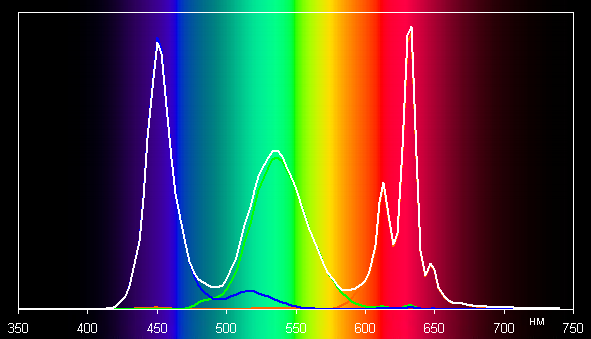 Напомним, что фотография не может служить надежным источником сведений о качестве цветопередачи и приводится только для условной наглядной иллюстрации. Причина в том, что спектральная чувствительность матрицы фотоаппарата неточно совпадает с этой характеристикой человеческого зрения.