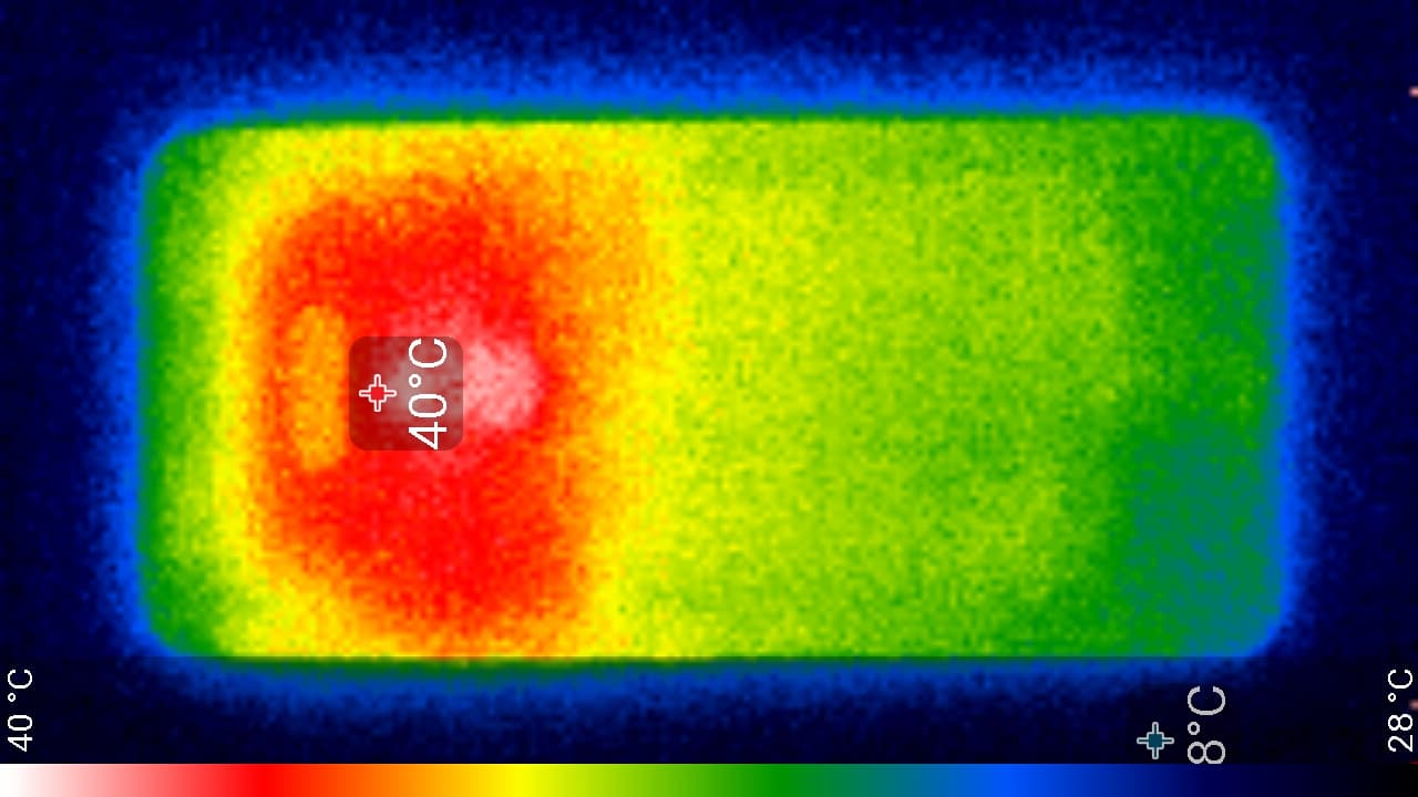 Нагрев больше локализован в верхней части аппарата, что, видимо, соответствует расположению микросхемы SoC. По данным теплокамеры, максимальный нагрев составил 40 градусов (при температуре окружающего воздуха в 24 градуса). Это средний нагрев в данном тесте для современных смартфонов.
