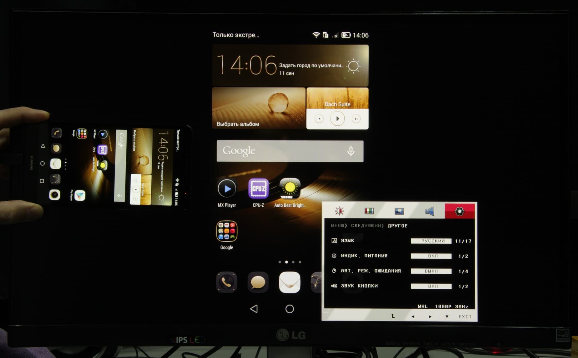 Такое масштабирование абсолютно неуместно и существенно уменьшает четкость изображения. Звук по MHL выводится (в данном случае звуки было слышно через подключенные к монитору наушники, так как в самом мониторе громкоговорителей нет) и имеет хорошее качество. При этом мультимедийные звуки через громкоговоритель самого смартфона не выводятся, а громкость регулируется кнопками на корпусе смартфона. Подключенный по MHL смартфон заряжается (по крайне мере, об этом свидетельствует индикатор заряда).