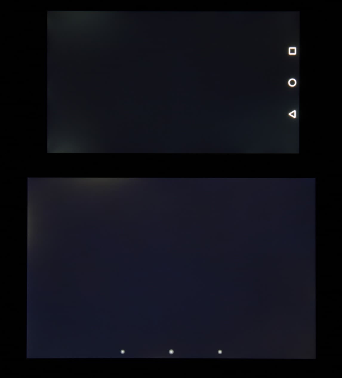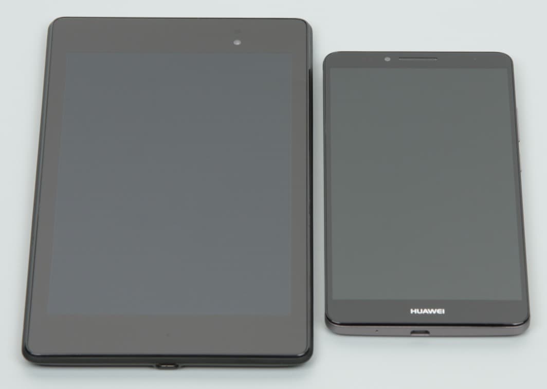 Лицевая поверхность экрана выполнена в виде стеклянной пластины с зеркально-гладкой поверхностью, устойчивой к появлению царапин. Судя по отражению объектов антибликовые свойства экрана не хуже, чем у экрана Google Nexus 7 (2013) (далее просто Nexus 7). Для наглядности приведем фотографию, на которой в выключенных экранах отражается белая поверхность (слева — Nexus 7, справа — Huawei Ascend Mate 7, далее их можно различать по размеру):