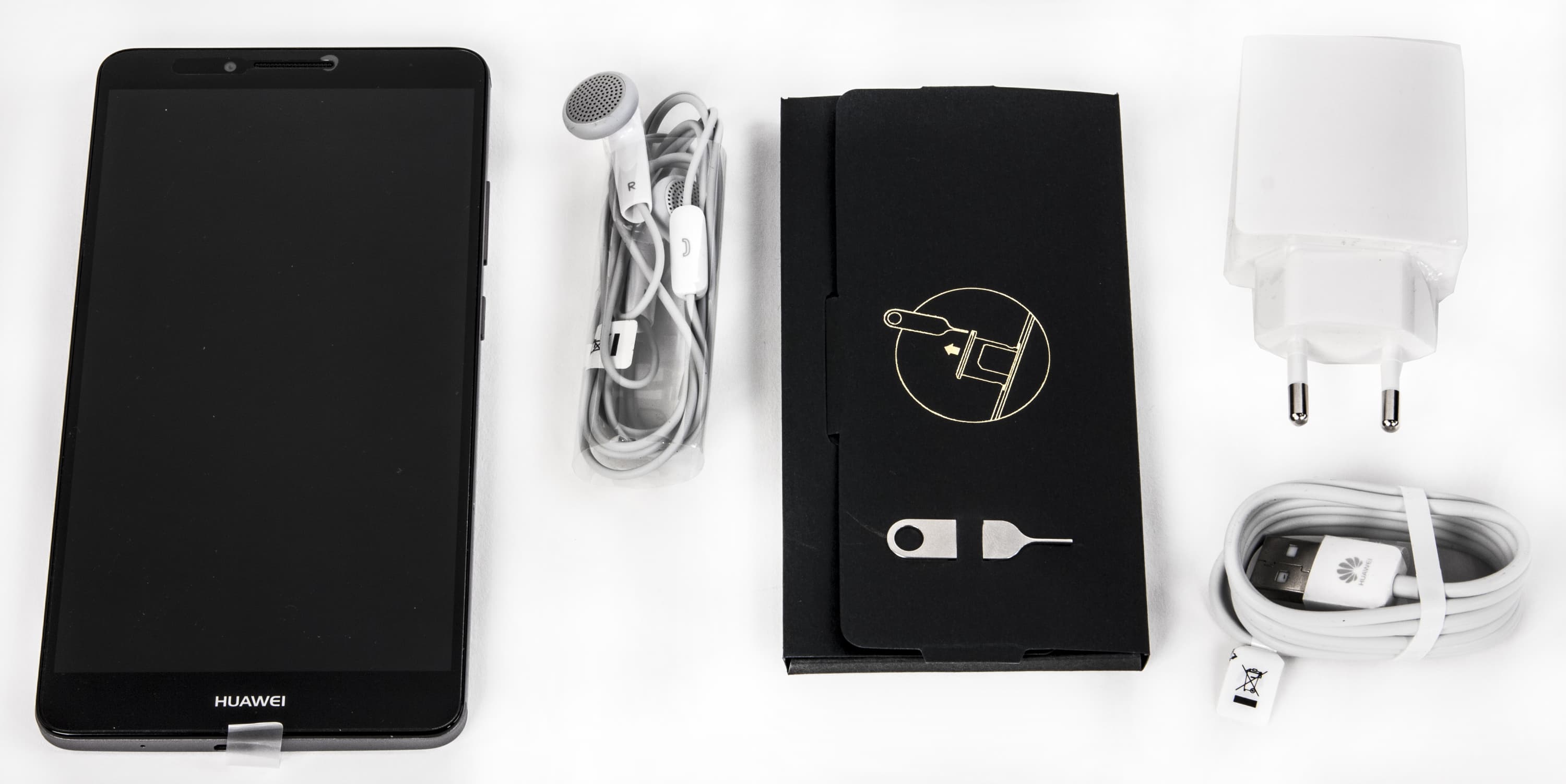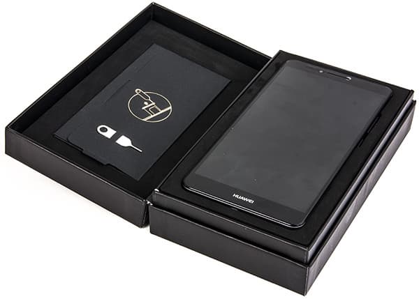 Смартфон поставляется в продажу в упаковке премиум-класса: стильная черная картонная коробка выполнена в виде шкатулки с откидной крышкой, на ее поверхности — минимум информации и стильный золотистый логотип. Внутри оборудовано несколько отделений с отдельными вкладывающимися в утопленные гнезда коробочками. В целом, содержимое упаковки подано весьма пафосно.